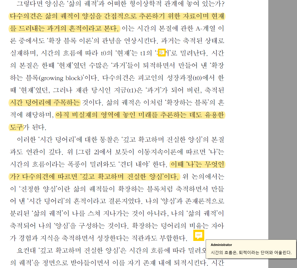 이러한 판단 기준은 양심을 일시적인 기분이나 충동(A-계열의 순간적 현재)이 아니라, 시간의 흐름을 견뎌낸 지속적인 실체로 파악하고 있음을 보여준다.