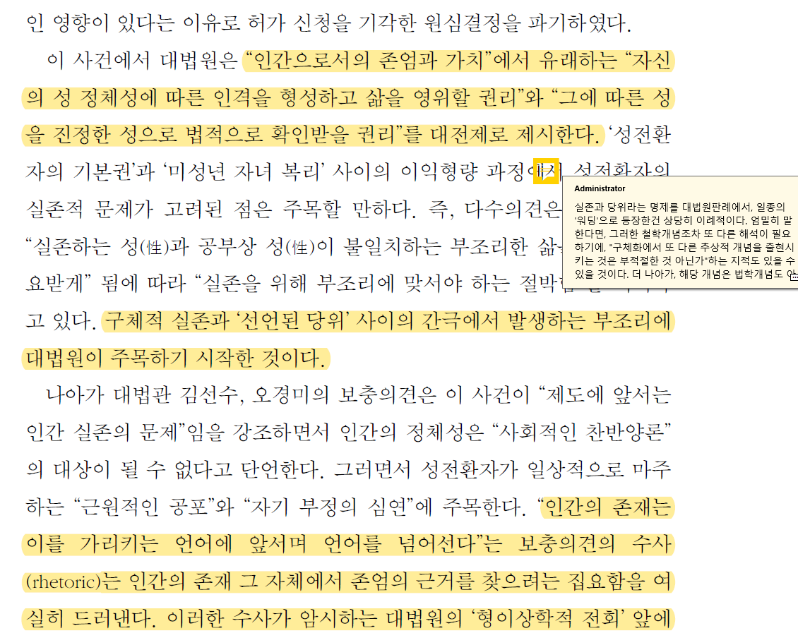 2022년 대법원 전원합의체는 미성년 자녀가 있는 성전환자의 성별정정을 허용하는 획기적인 결정을 내렸다. 다수의견은 "인간으로서의 존엄과 가치"에서 유래하는 "자신의 성 정체성에 따른 인격을 형성하고 삶을 영위할 권리"를 강조했다. 특히 김선수, 오경미 대법관의 보충의견은 "인간의 존재는 이를 가리키는 언어에 앞서며 언어를 넘어선다"고 설파하며, 제도가 인간 실존을 재단할 수 없음을 선언했다.
