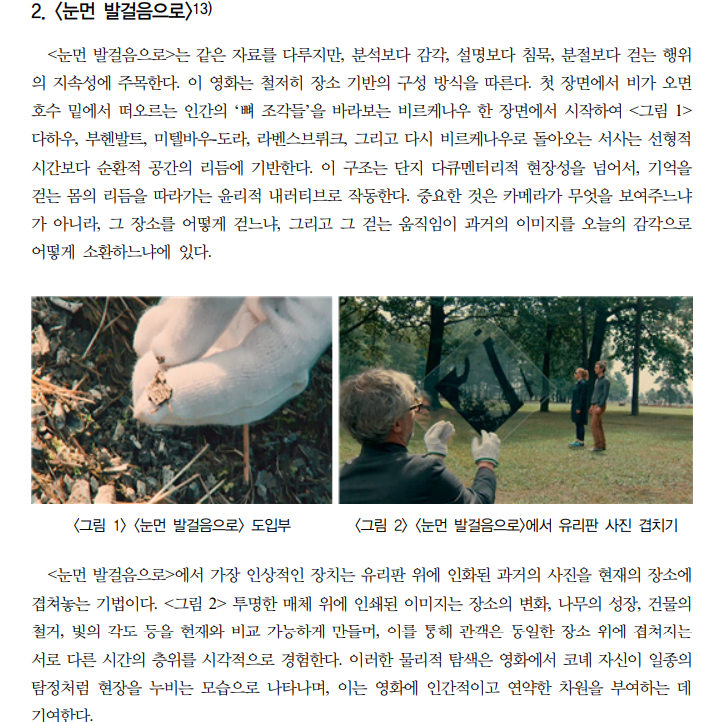 <눈먼 발걸음으로>는 분석보다 감각, 설명보다 침묵, 분절보다 걷는 행위의 지속성에 주목한다.