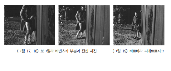 사진 속 수용자 중 한명인 마리아 쿠시미에르추크는 절제된 표정으로 다리의 흉터를 드러내고, 다른 한명인 보그밀라 바빈스카는 허벅지를 들어 올린 채 카메라를 정면으로 응시하며 굴복하지 않는 '고요한 단호함'을 보여준다. 그중 가장 어린 피해자였던 바르바라 피에트르지크는 '미소'를 짓고 있다.