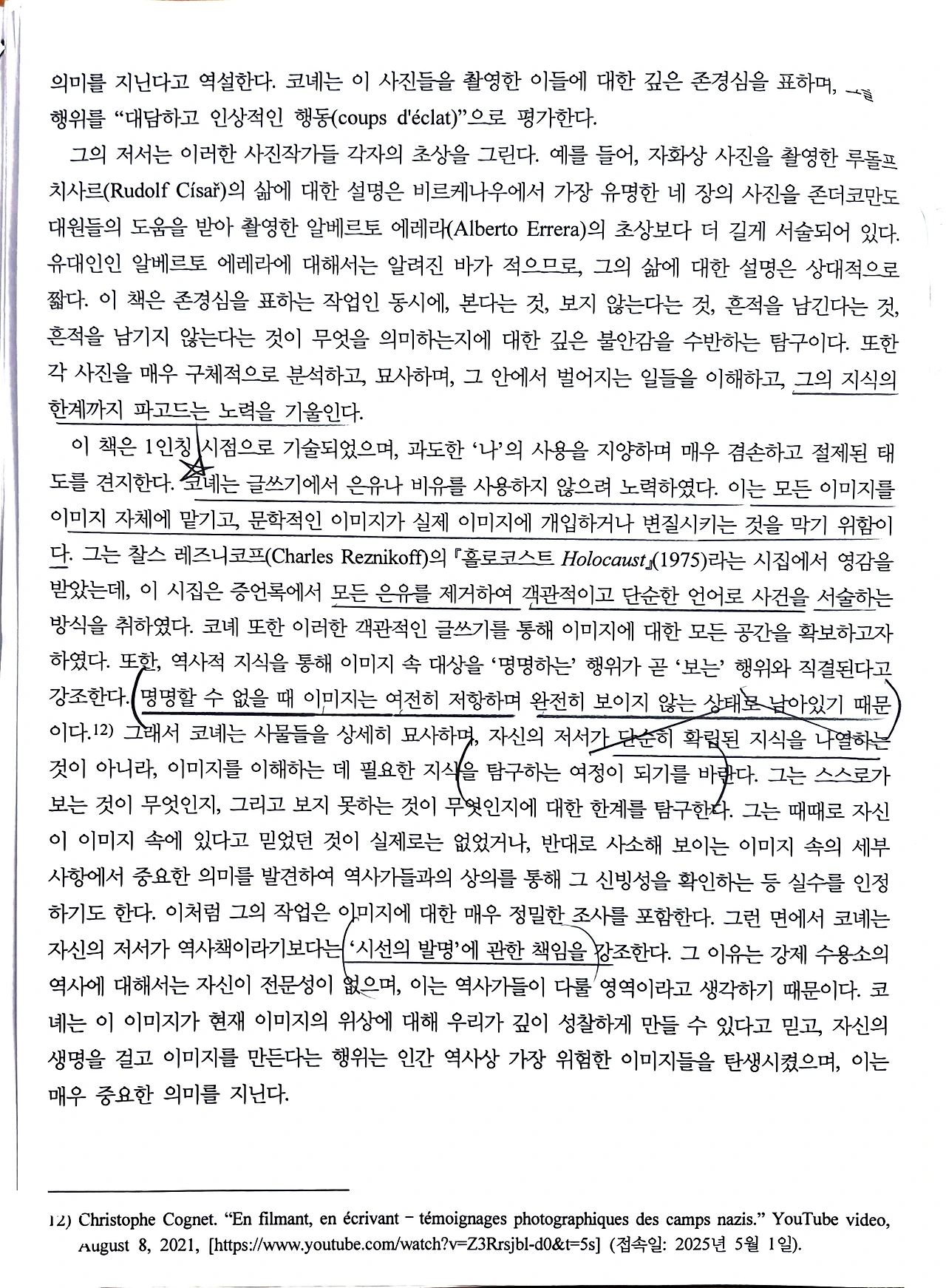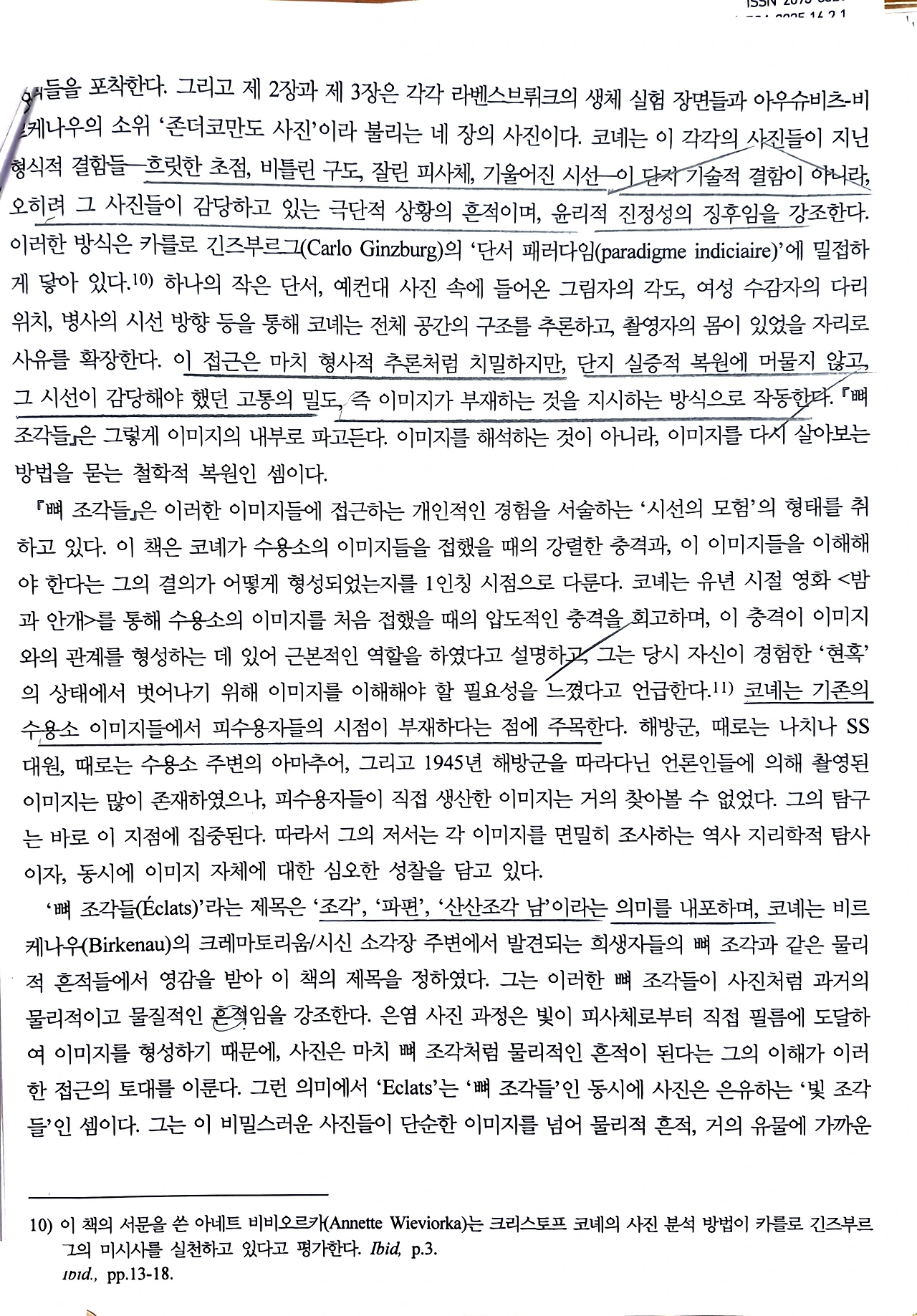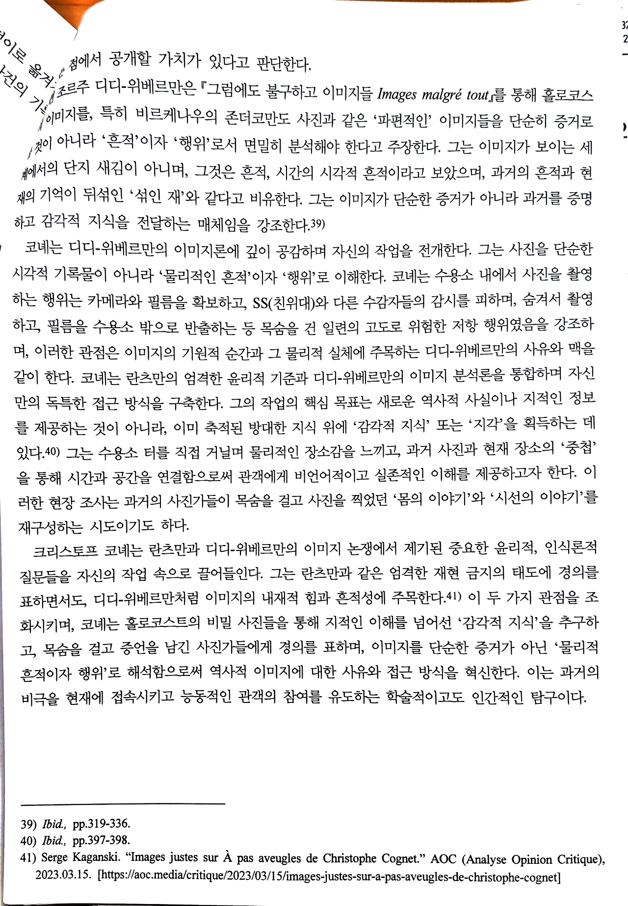 논문은 아우슈비츠 수용소의 수감자들이 목숨을 걸고 촬영한 비밀사진들이 지닌 역사적, 윤리적, 미학적 의미를 고찰하며, 단순히 과거의 기록이 아니라 극한 상황에서 촬영된 시선의 흔적이자 물질적 흔적임을 강조한다.