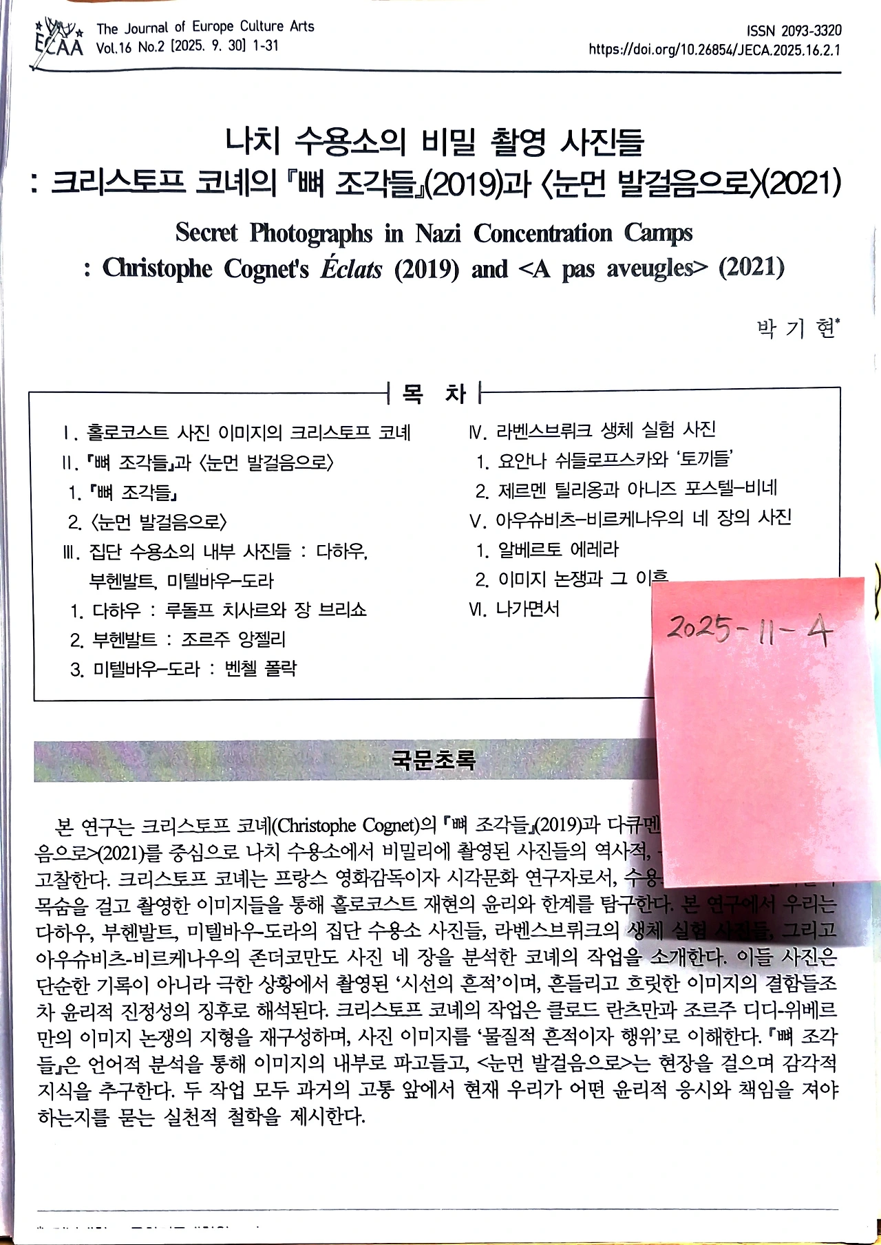 박기현, 《나치 수용소의 비밀 촬영 사진들 : 크리스토프 코녜의 『뼈 조각들』(2019)과 <눈먼 발걸음으로>(2021)》, 유럽문화예술학회, 『유럽문학예술학논집』제16호 제2호, 2025. 9., 1-31면