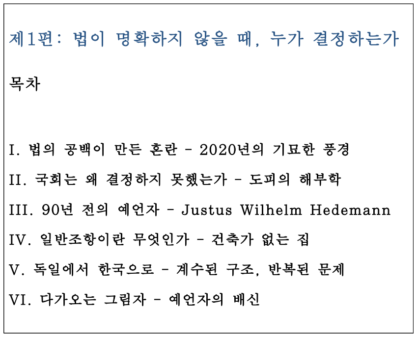 그런데 90년 전, 독일의 한 법학자가 정확히 이 문제를 예견했다. Justus Wilhelm Hedemann, 바로 헤데만이다. 그는 1933년 출판한 책에서 입법자가 어려운 결정을 회피하고 법관에게 떠넘기는 현상을 "일반조항으로의 도피"라고 불렀다.