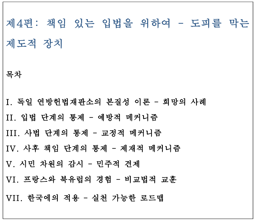 (3) 사후책임 단계에서는 가장 혁신적 제안이 필요하다. 입법자가 헌법재판소의 개정명령을 무시하면 국가배상 책임을 인정하는 것이다. 독일은 입법자의 위헌적 입법이나 입법 부작위로 인한 손해에 대해 국가배상을 인정한다. 한국도 이를 도입하여 입법자에게 실질적 압박을 가해야 한다. 입법자가 도피한 대가를 국민이 아니라 입법자가 치르게 만드는 것이다.