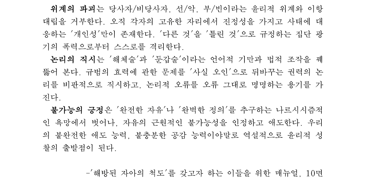 그렇다면 진정한 자유는 '자유를 획득하려는 투쟁'에서 시작되는 것이 아니라, '완전한 자유의 불가능성'을 인정하고 애도하는 행위에서 비롯된다고도 볼 수 있을 것이다. 우리의 나르시시즘적인 태도, 즉 '무제 시민으로서, 나는 충분히 이성적이니 자유로울 수 있다'는 오만을 버리고, 자유의 불가능성을 깊이 체감하게 되었을 때, 그래야만 비로소 '더 나은 자유'를 향한 위계적이고 경쟁적인 논의에서 벗어날 수 있을 것이다.(오디오로그 끄는 소리)