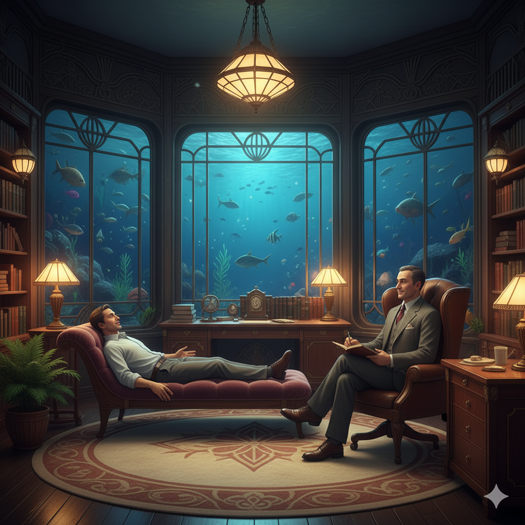 Today’s weather: [Clear]. It felt exactly the same as yesterday. Even thinking about it now, I'm not sure if there's much worth recalling, but if my memory serves, that's how it was. That day, just like any other, at seven in the morning, the old desk clock with its rusty hands, hung mutely on the wall, seemed to glare down from the ceiling. Outside was still covered by the profound seawater. It was a hue starkly different from the vivid blue I remembered seeing on the surface—somewhat dark, even.