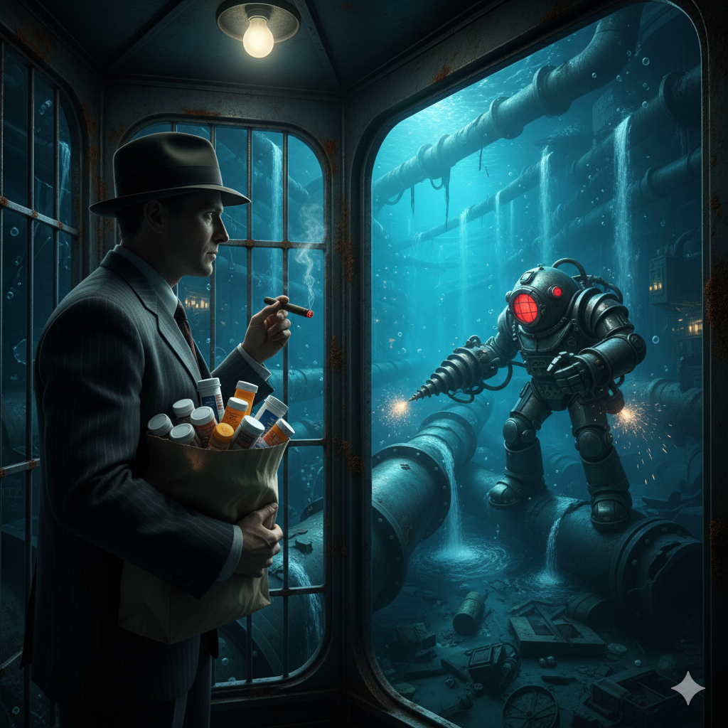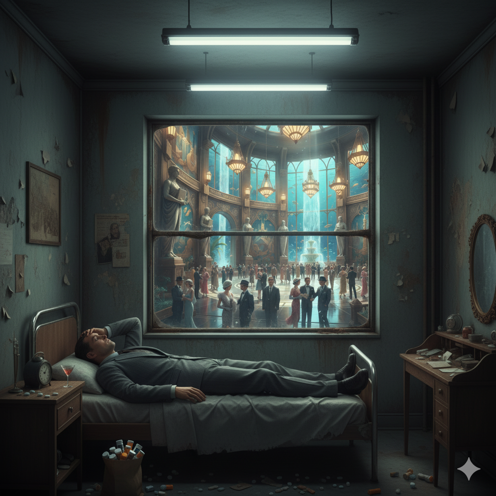 The therapist immediately recognized the way I had rushed out. [The haggard look], [the aging body]—the typical appearance of an 'old man' easily found in any classic literature. It was only natural that this state would appear vividly clear to him. The commitment to strict punctuality was a mindset I had always kept, even when I was on the surface. And that conviction hadn't changed, whether I was resolving to relocate to this dark, fathomless deep-sea city of [Mu-Jae (Untitled)] or settling down [right here, right now].