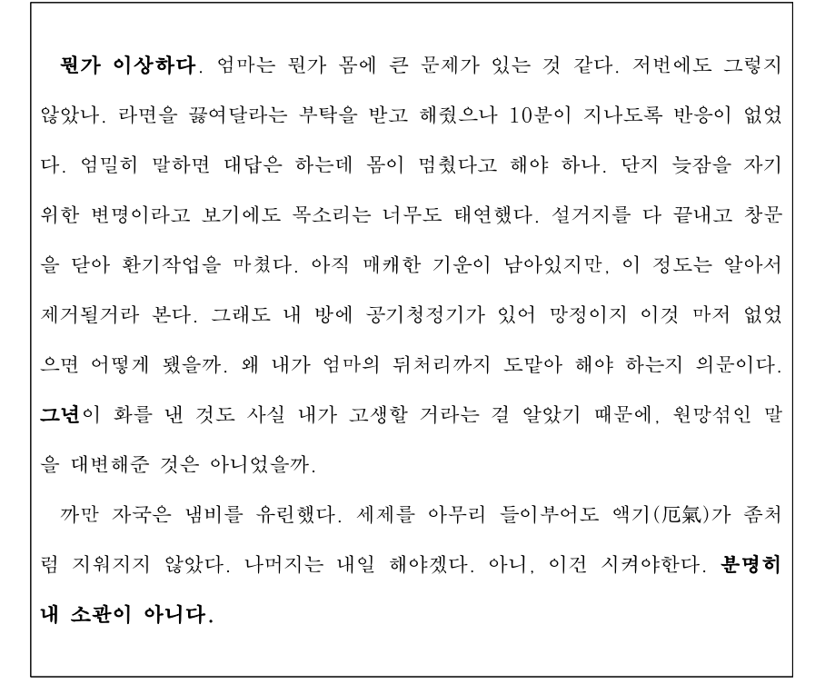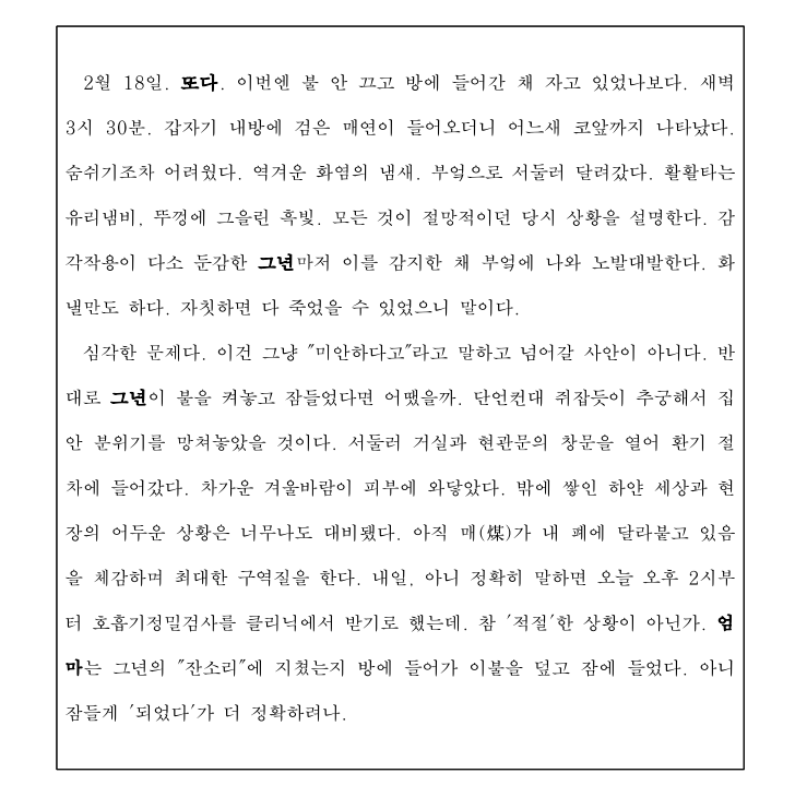 (……)예외적으로 취해진 '잠정적 조치'가 어느새 '통치술'로 전환되는 이 현상은, 민주주의와 절대주의 사이의 전통적인 구분을 무너뜨리는 위협, 아니 이미 무너뜨린 현실이었다. 그러한 예외상태는 마치 민주주의와 절대주의 사이를 확정 불가능하게 만드는 위험한 문턱처럼 보인다. 우리가 발을 딛고 있는 이 평범한 일상이 언제든 법의 바깥으로 밀려날 수 있는, 가히 헐벗은 삶으로서 호모 사케르라고 불리던 존재의 그림자 아래 놓여있음을, 나는 잊을 수 없었다.