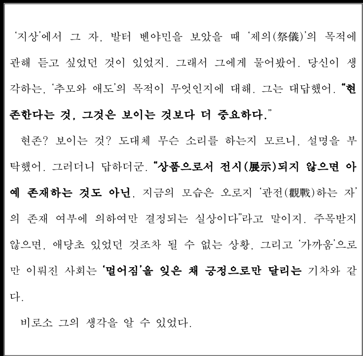 '지상'에선 아파트가 나의 '장소'였다면, 이곳 '무제'에선 아파트가 나의 '비장소'다. 상관없다. 사색만 할 수 있다면, [아직 살아남은 것]일 테니까. 아직은. 말이다. 서둘러 출근해야겠어.(오디오로그 끄는 소리)