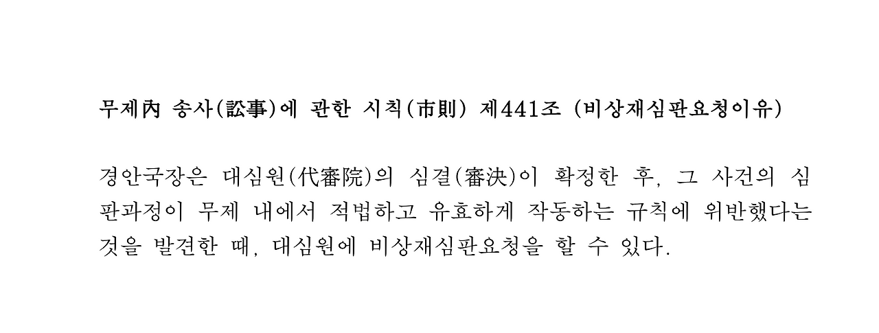 무제내 송사에 관한 시칙 제441조가 비상재심판요청의 요건으로 규정한 '그 사건의 심판과정이 무제 내에서 적법하고 유효하게 작동하는 규칙에 위반한 때'(p)의 해석 문제입니다.