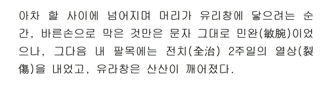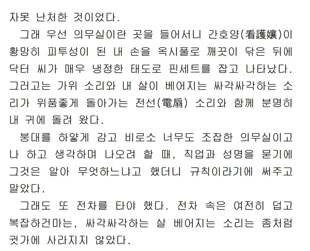 사고 직후 화자는 혼돈 상태에 빠진다. 전차가 급커브를 돌고, 사람들이 넘어지며, 유리창이 깨지고, 팔목에 열상이 생긴다. 이와 동시에 차장 감독의 친절, 의무실로 연행되는 과정에서의 타인의 시선에 대한 우려("전차표라도 속이려다가... 붙잡혀 가는 것이나 아닌가"), 간호양의 처치, 그리고 "싸각싸각하는" 살이 베어지는 소리 등 복잡한 인지물질들이 활성화된다.