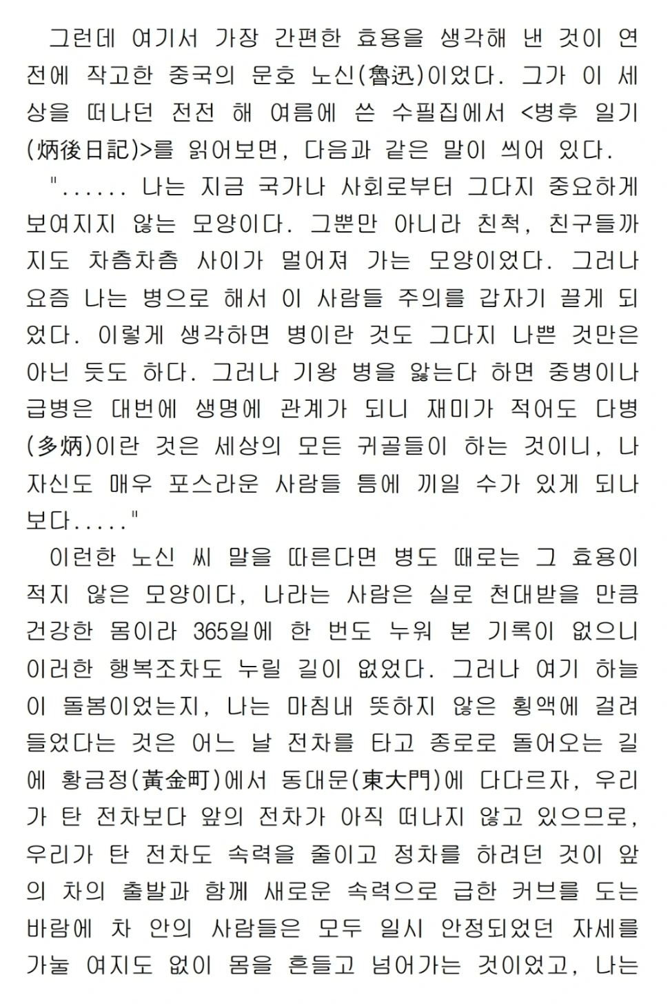 화자는 이 혼란스러운 감정 상태를 '번역'하기 위해 하나의 지적 프레임을 가져온다. 바로 노신(魯迅)의 <병후 일기>이다. 노신은 병(病)이 타인의 '주의'를 끌어 자신의 존재를 확인시키는 '효용'이 있다고 했다. 화자는 자신의 '횡액' 역시 이러한 효용을 가질 수 있는지 '탐색'한다. 그는 자신의 상태를 노신이 언급한 '중병', '급병', '다병'의 기준에 대입해본다.