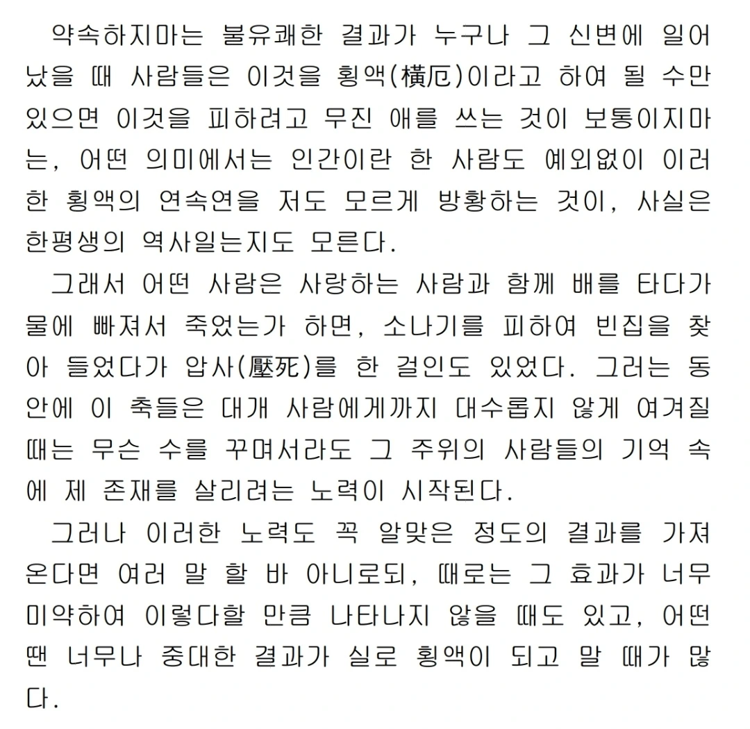 나는, 오늘 글에서 엄밀한 논리적 도구로서의 이모티브 이론을 하나의 구체적인 서사(narrative)에 적용하여, 이육사의 1927년 회고록 내용 중 하나로서, [횡액(橫厄)]이라 명명된 개인적 불행의 경험이 어떻게 언어적 행위를 통해 규범적으로 처리되는지를 고찰하고자 한다. 분석 대상이 되는 문서는 전차 사고라는 돌발적 횡액을 겪은 이가 자신의 경험과 내면의 파동, 그리고 노신(魯迅)의 수필을 인용하며 사유의 과정을 기록한 한 편의 수필(이하 '횡액 서사')이다.
