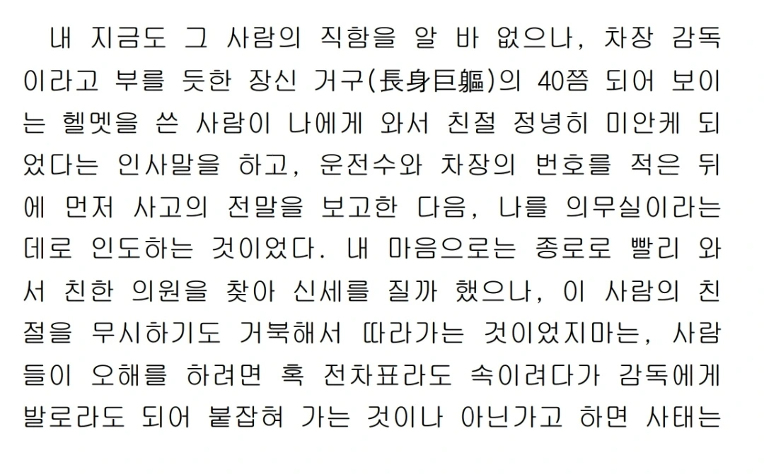 첫째, 감정은 단순한 혼돈이 아니라 '언어'를 매개로 규범화될 수 있는 대상이라는 점이다. '횡액 서사'의 화자는 법적·제도적 보상(전차 회사의 규칙적 대응이나 의무실의 조잡한 처치)에서는 어떠한 위안도 얻지 못했다. 오히려 그는 '적는 행위'라는 사적이모티브를 통해 스스로의 감정적 고통을 관리하고 새로운 규범을 정립했다.