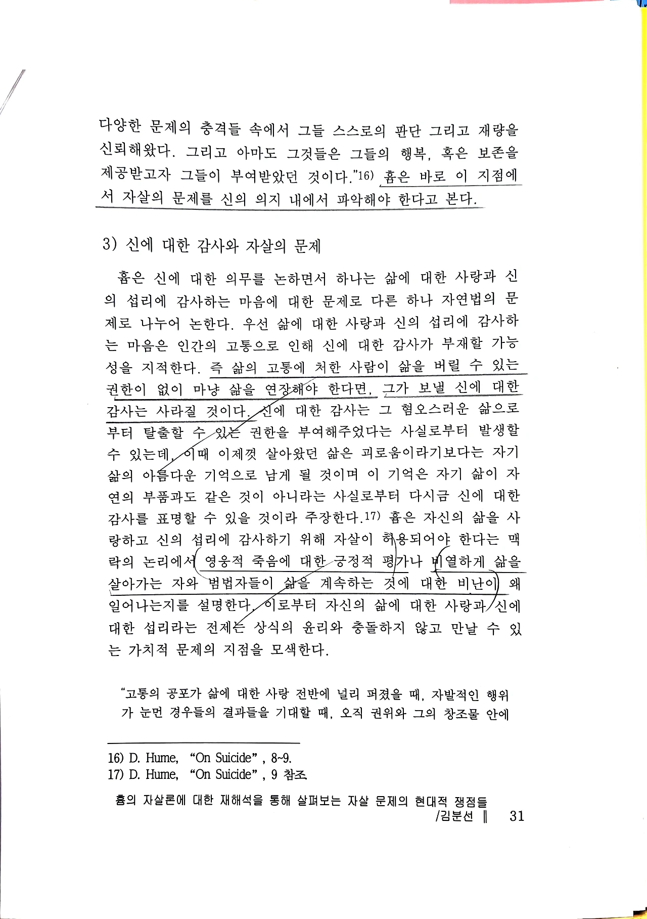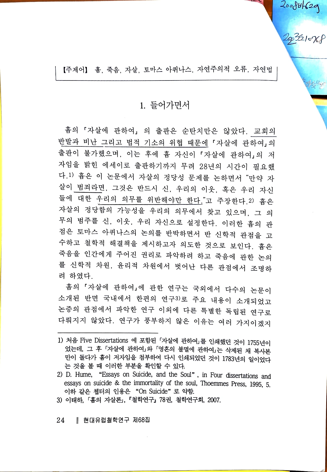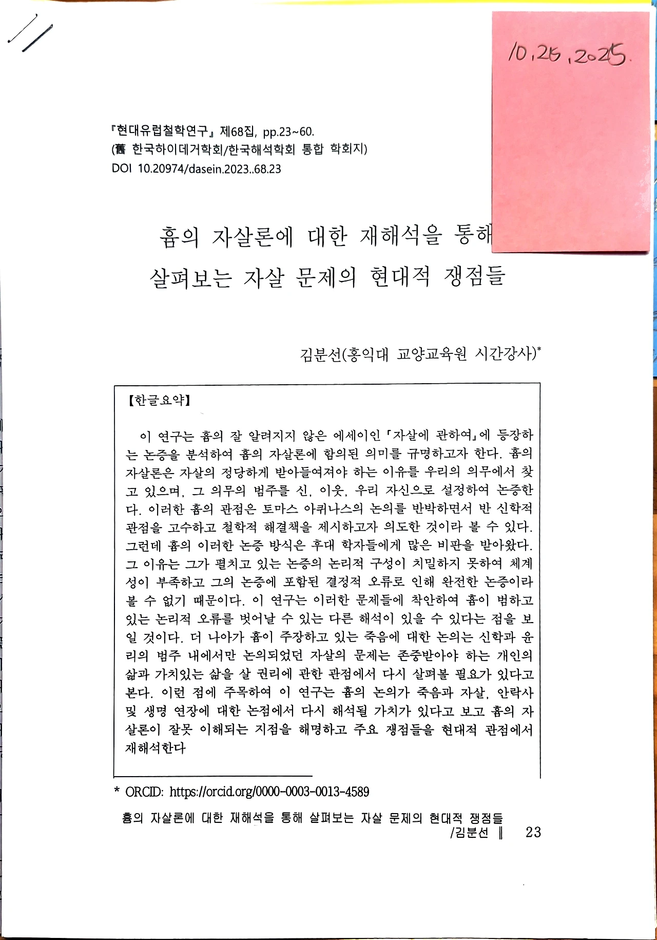 김분선, 《흄의 자살론에 대한 재해석을 통해 살펴보는 자살 문제의 현대적 쟁점들 》한국현대유럽철학회, 현대유럽철학연구 제68집, 2023, 23-60면