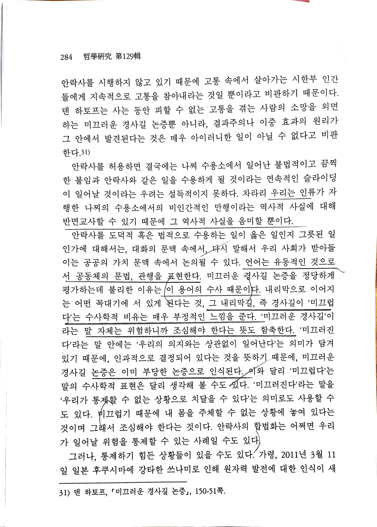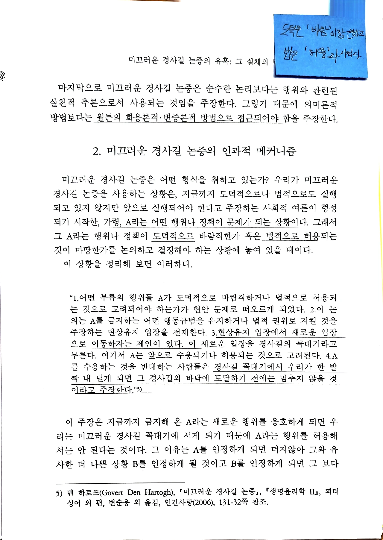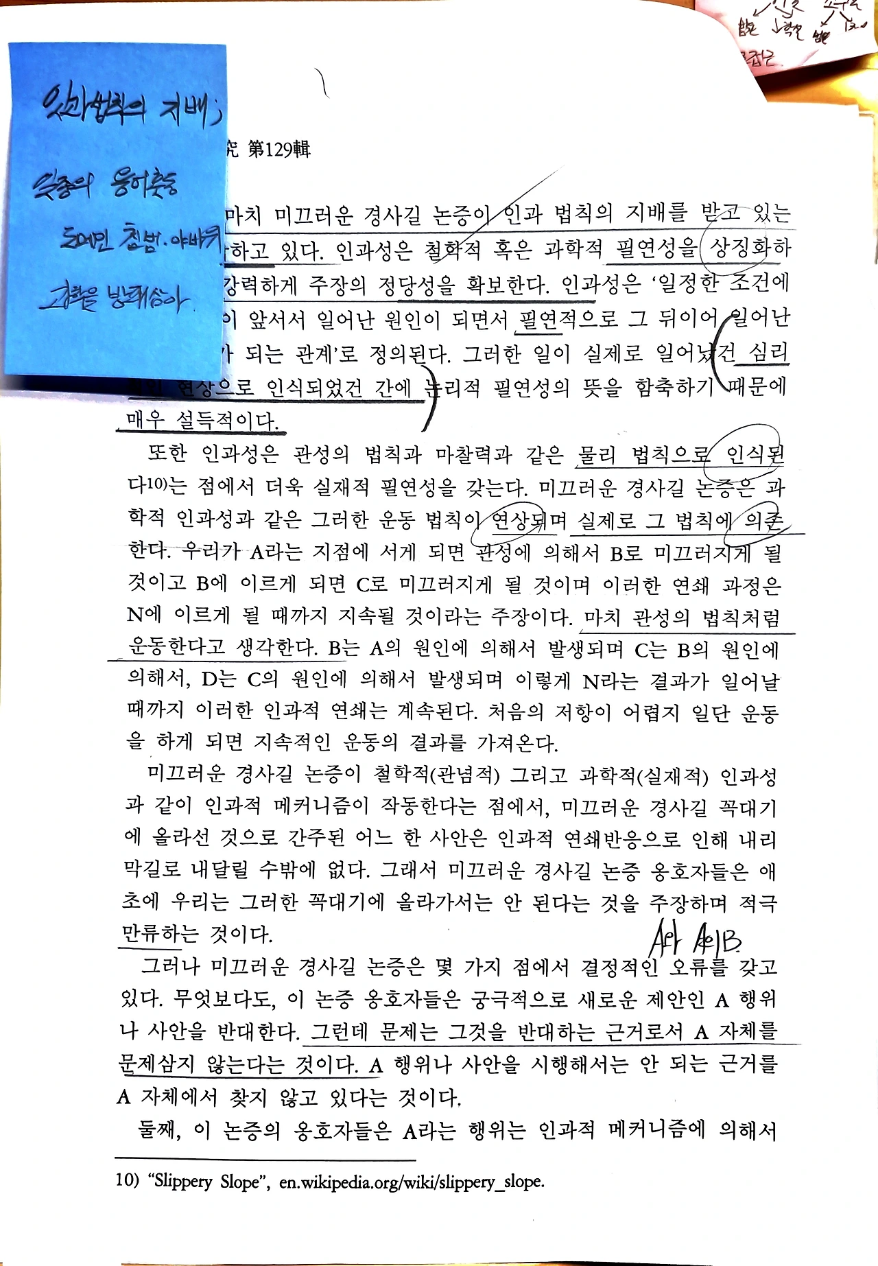 이에 대한 가장 강력한 반론으로 예상되는 ‘미끄러운 경사길 논증(slippery slope argument)’을 이혜정의 정교한 분석 도구를 활용하여 선제적으로 구성한 뒤 이를 극복하는 방법론을 제시한다.