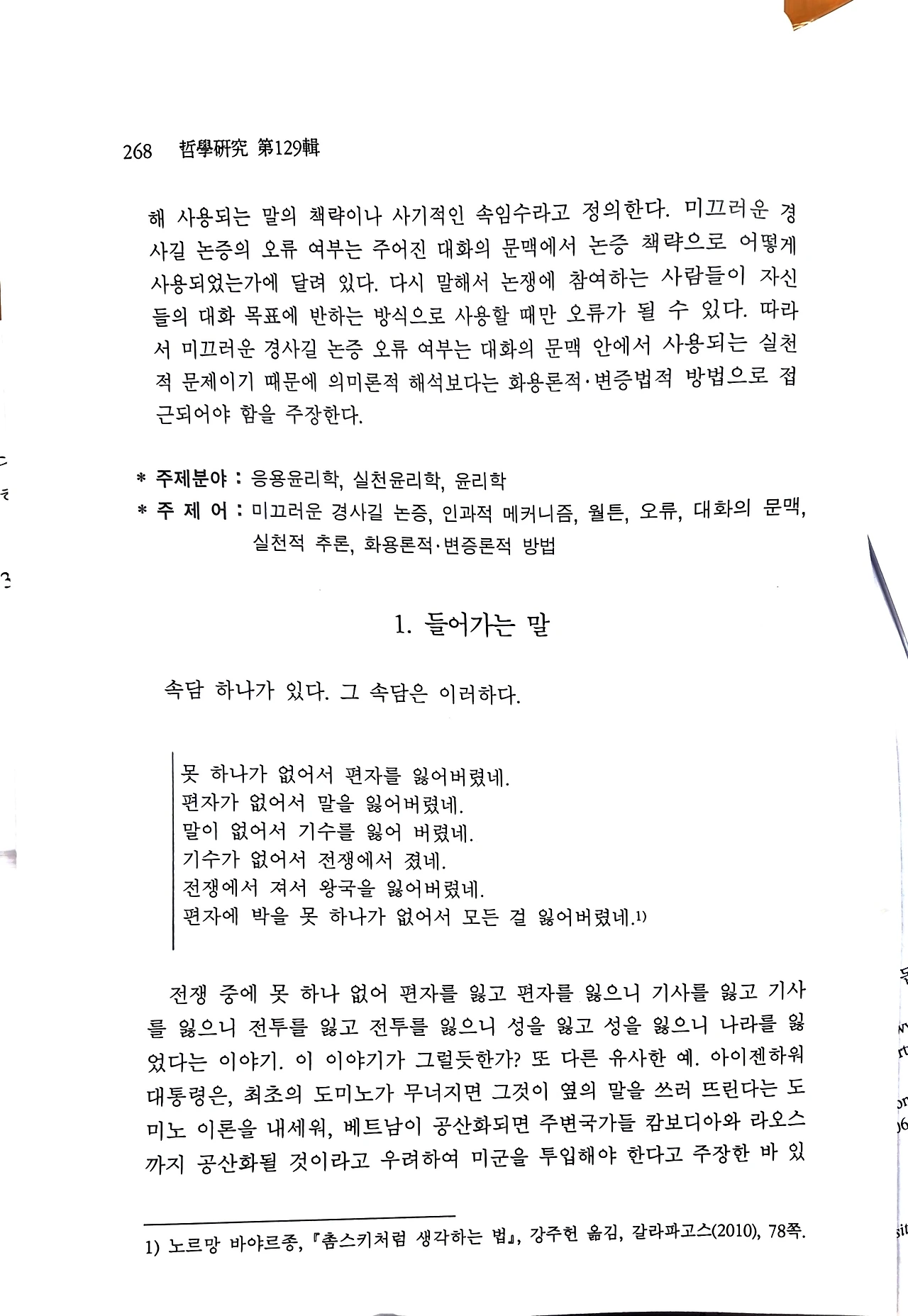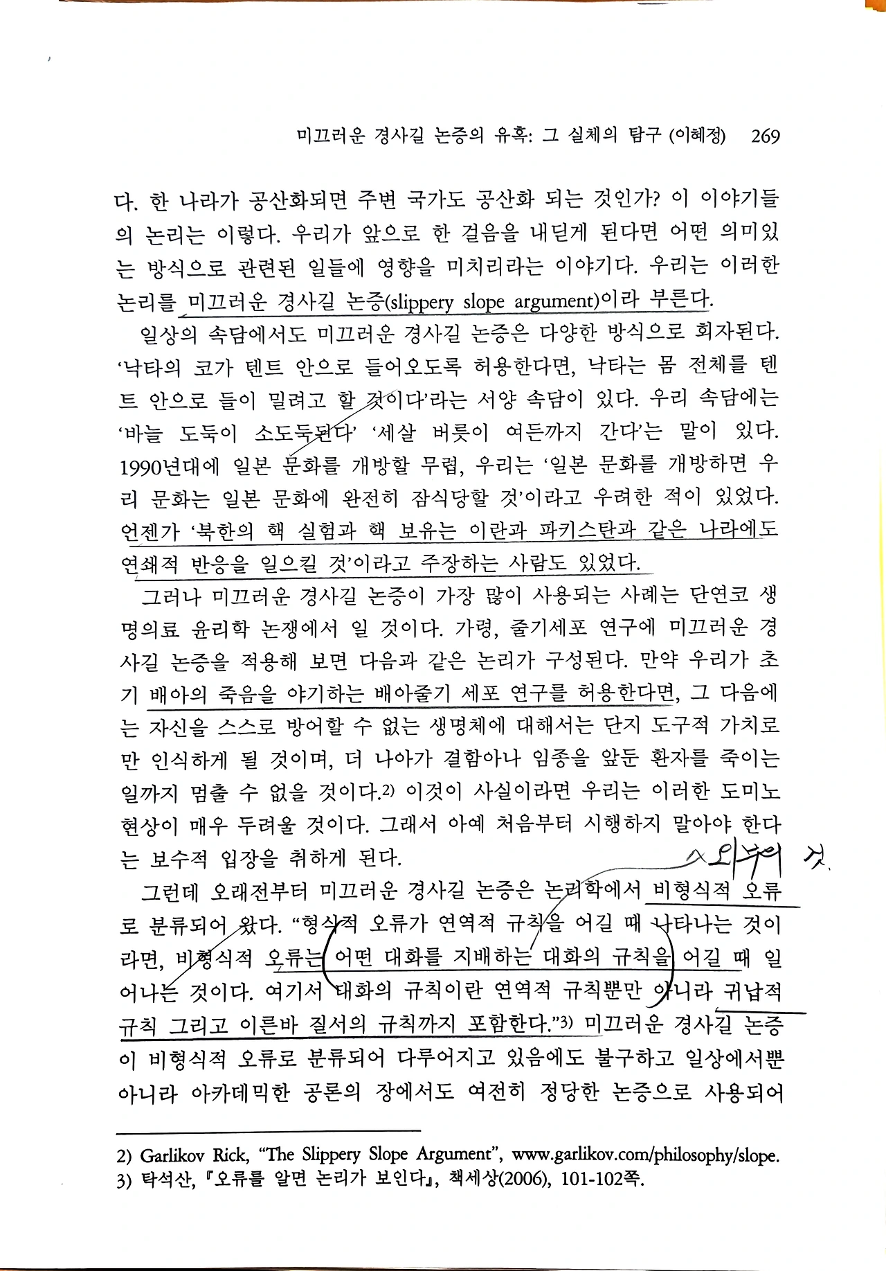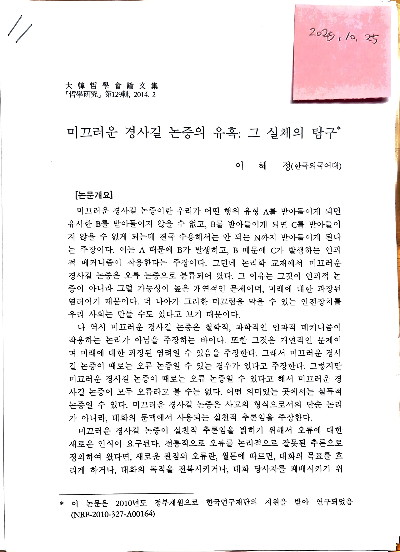 이혜정,《미끄러운 경사길 논증의 유혹: 그 실체의 탐구》, 대한철학회, 철학연구 제129호, 2014. 2. , 267-290면