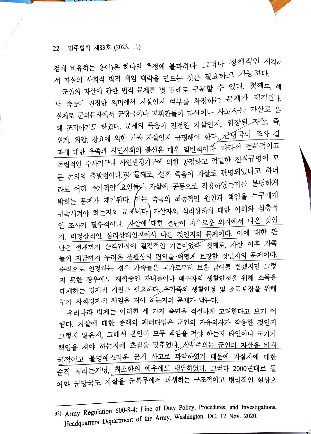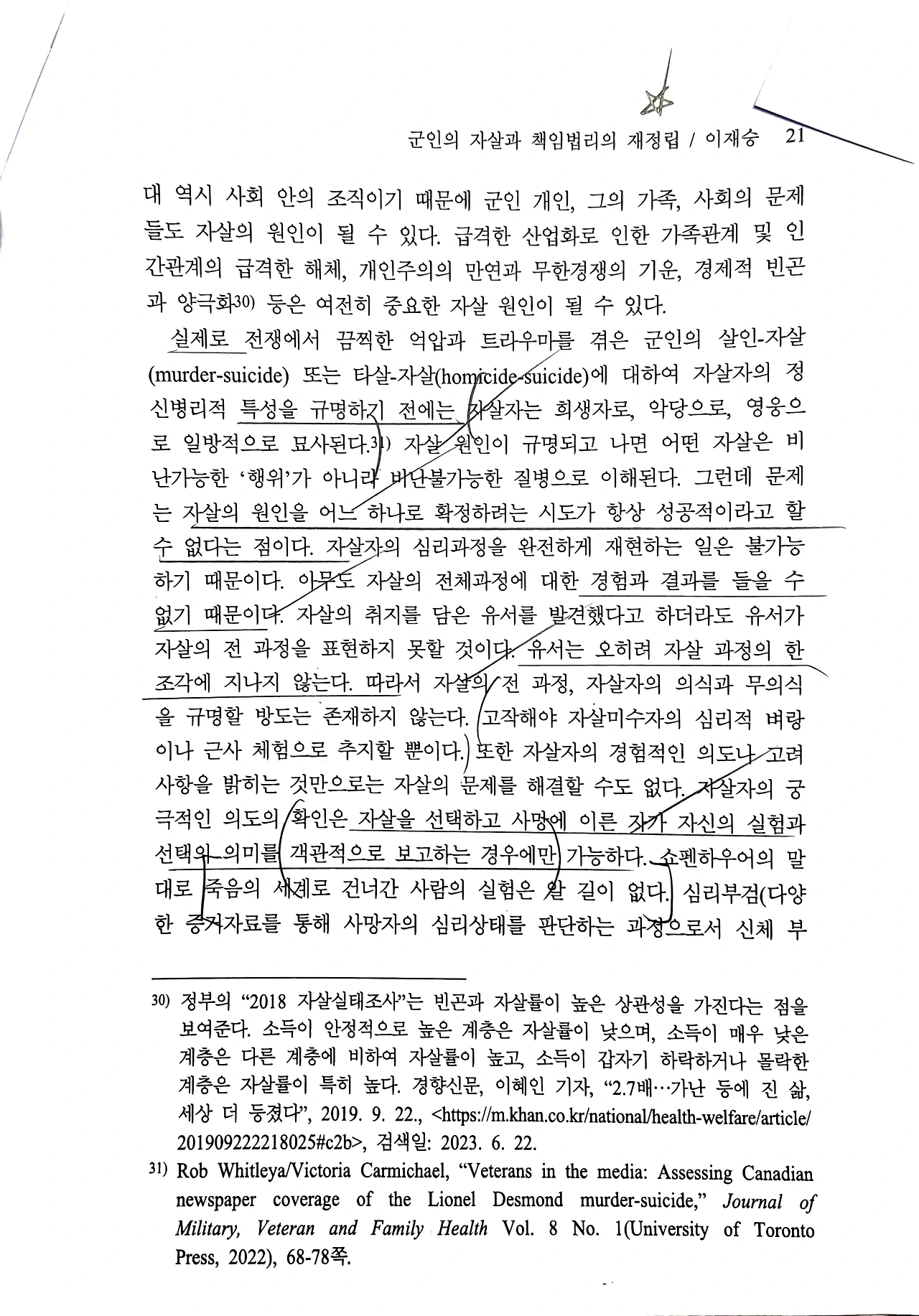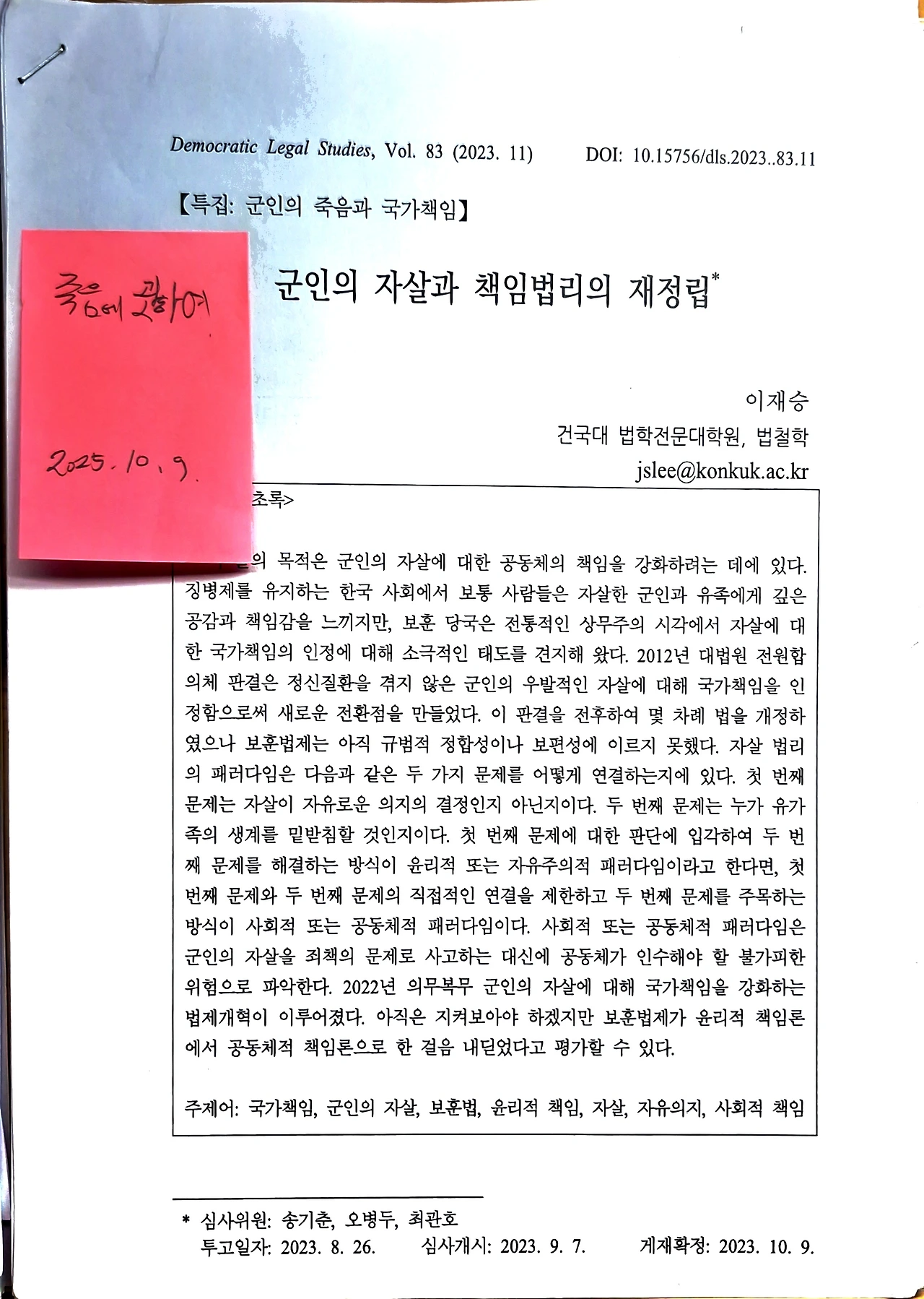 이재승, 《군인의 자살과 책임법리의 재정립》, 민주법학연구회, 민주법학 제83호, 2023. 11, 11-51면