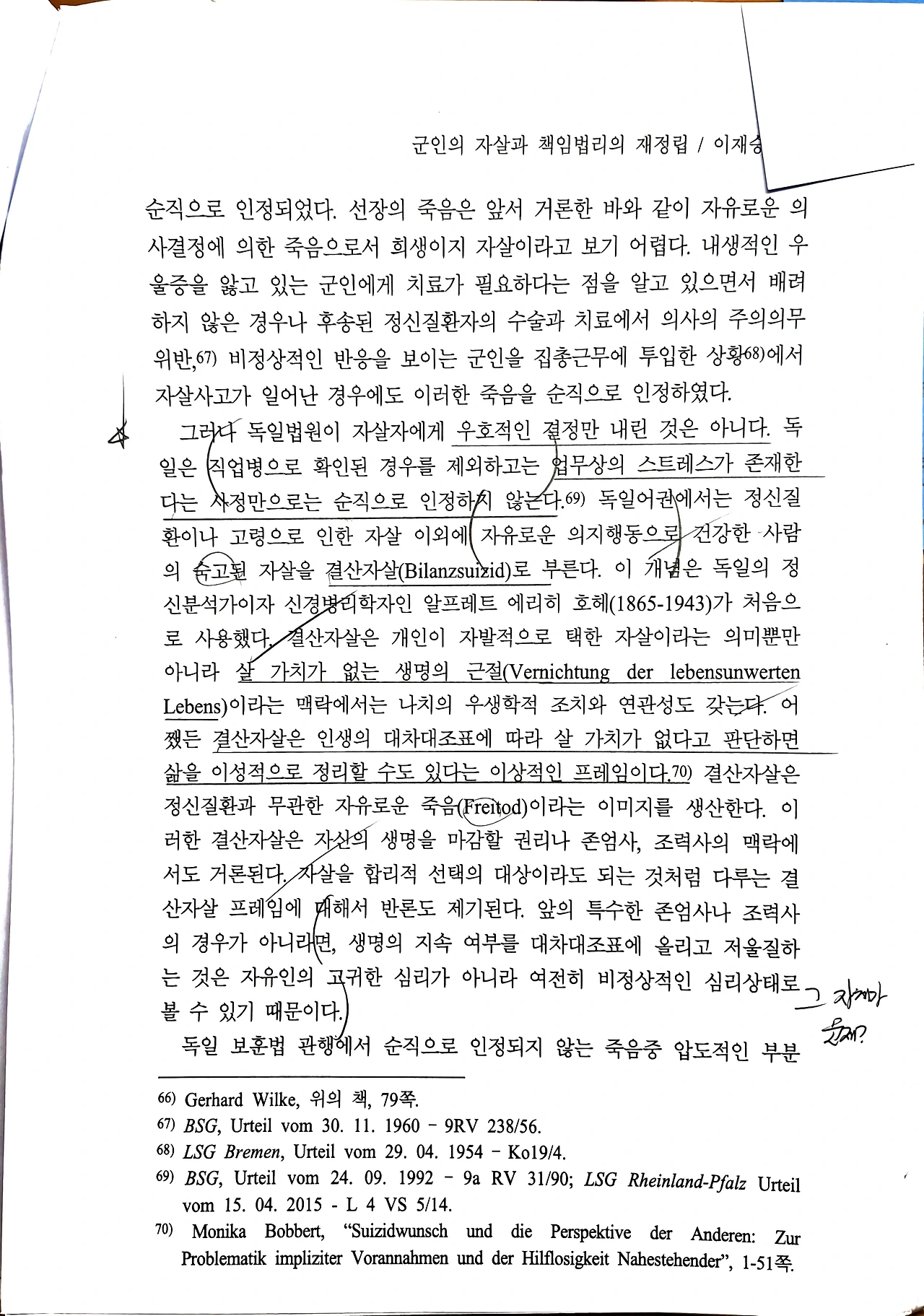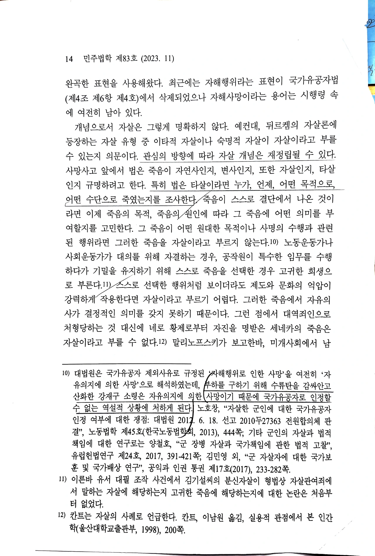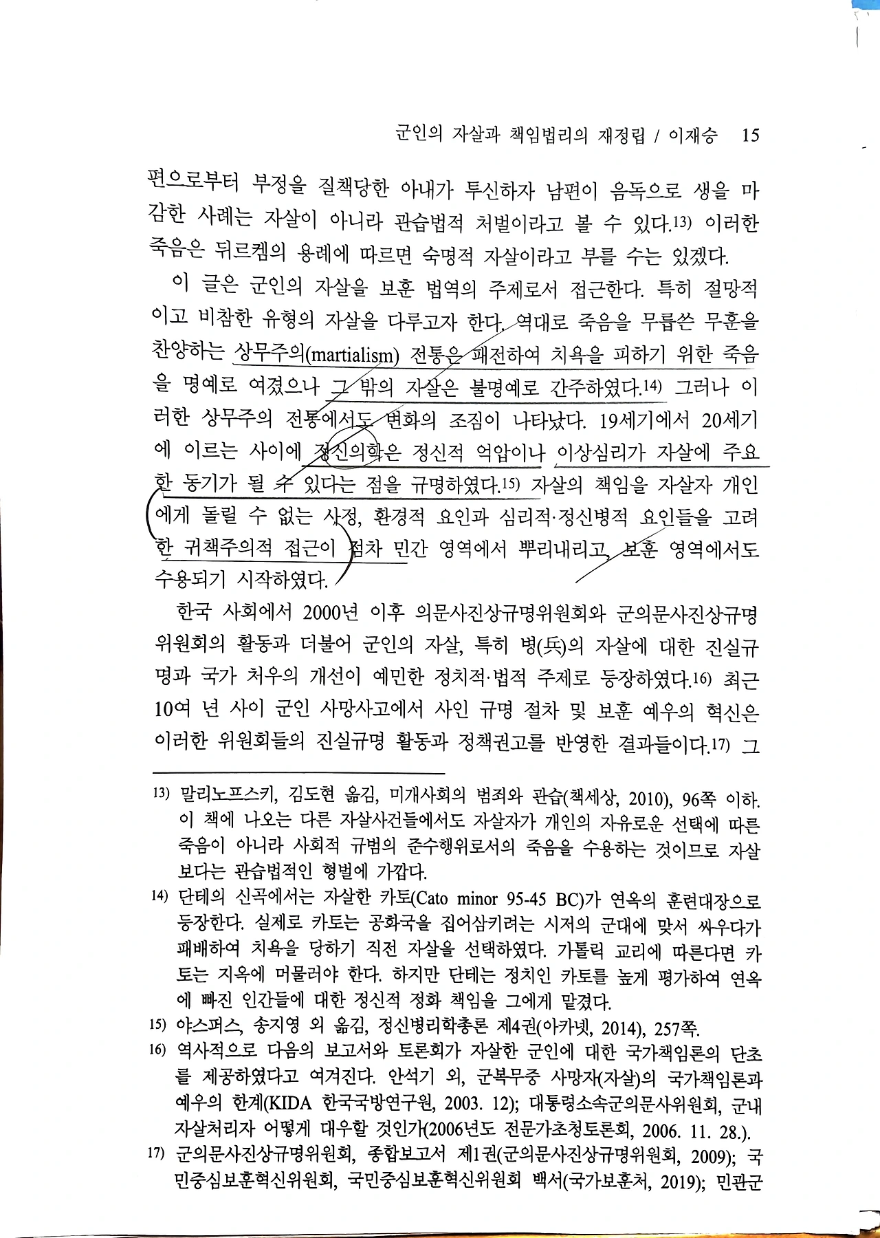 이재승, 《군인의 자살과 책임법리의 재정립》, 민주법학연구회, 민주법학 제83호, 2023. 11, 11-51면