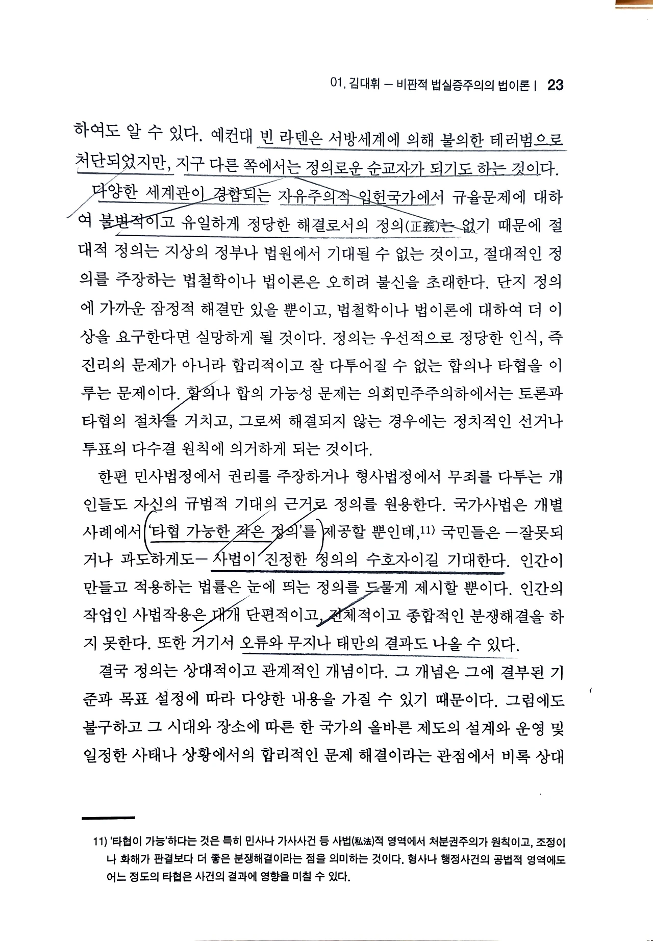 김대휘는, 켈젠(Kelsen)이나 로스(Ross)와 같은 고전적 법실증주의자들이 정의를 비합리적·정서적 가치판단으로 간주하여 법이론에서 배제하려 한 '정의 부정론'과는 명확히 선을 그으면서, ["비판적" 법실증주의]는 긍정적 정의, 즉 '무엇이 정의로운가'에 대한 적극적이고 실체적인 합의가 어렵다는 점은 인정하고 있음을 드러낸다.