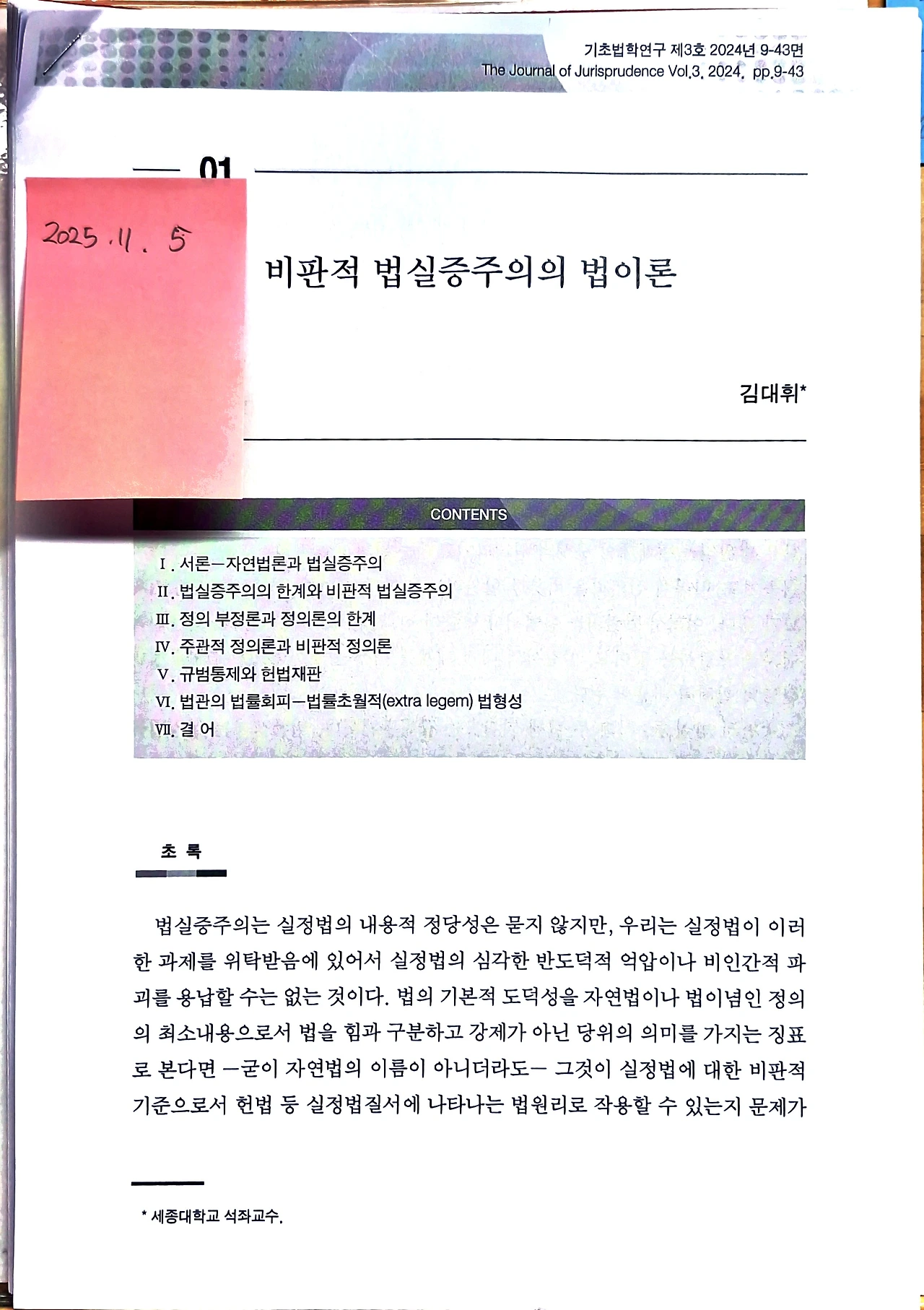 김대휘, 《비판적 법실증주의의 법이론》, 서울대학교 법학연구소 법이론연구센터, 『기초법학연구』제3호, 2024. 5., 9-43면