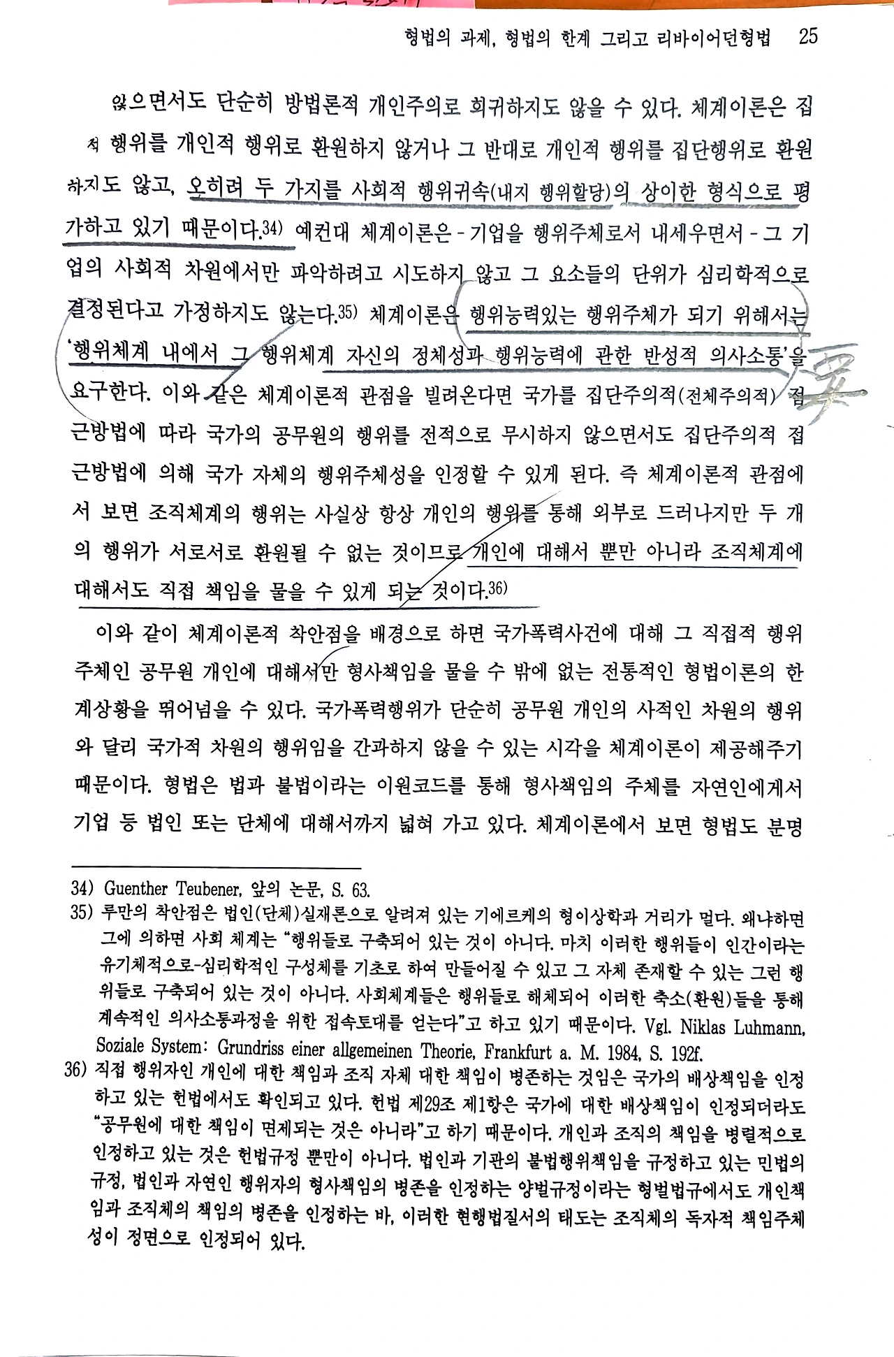 대상논문은 개인주의와 집단주의의 낡은 이분법을 극복할 대안으로서 니클라스 루만의 체계이론을 원용한다. 루만의 이론에 따르면, '조직(국가)'의 행위와 '개인(공무원)'의 행위는 '서로서로 환원될 수 없는(nicht reduzierbar)' 별개의 '사회적 행위귀속'의 형식이다. 이때, '조직'이란, 개인과는 분리된 '폐쇄된 체계'로서, '자기생산적' 의사소통을 통해 스스로를 재생산하며, 개인의 의사와는 분리된 독자적 행위주체성을 가질 수 있다. 이는 국가폭력이라는 현상에 대해, 공무원 개인의 책임(준-리바이어던형법)과 국가라는 조직 자체의 책임(리바이어던형법)을 병렬적으로 묻는 것을 이론적으로 정당화하는 강력한 기제가 된다.