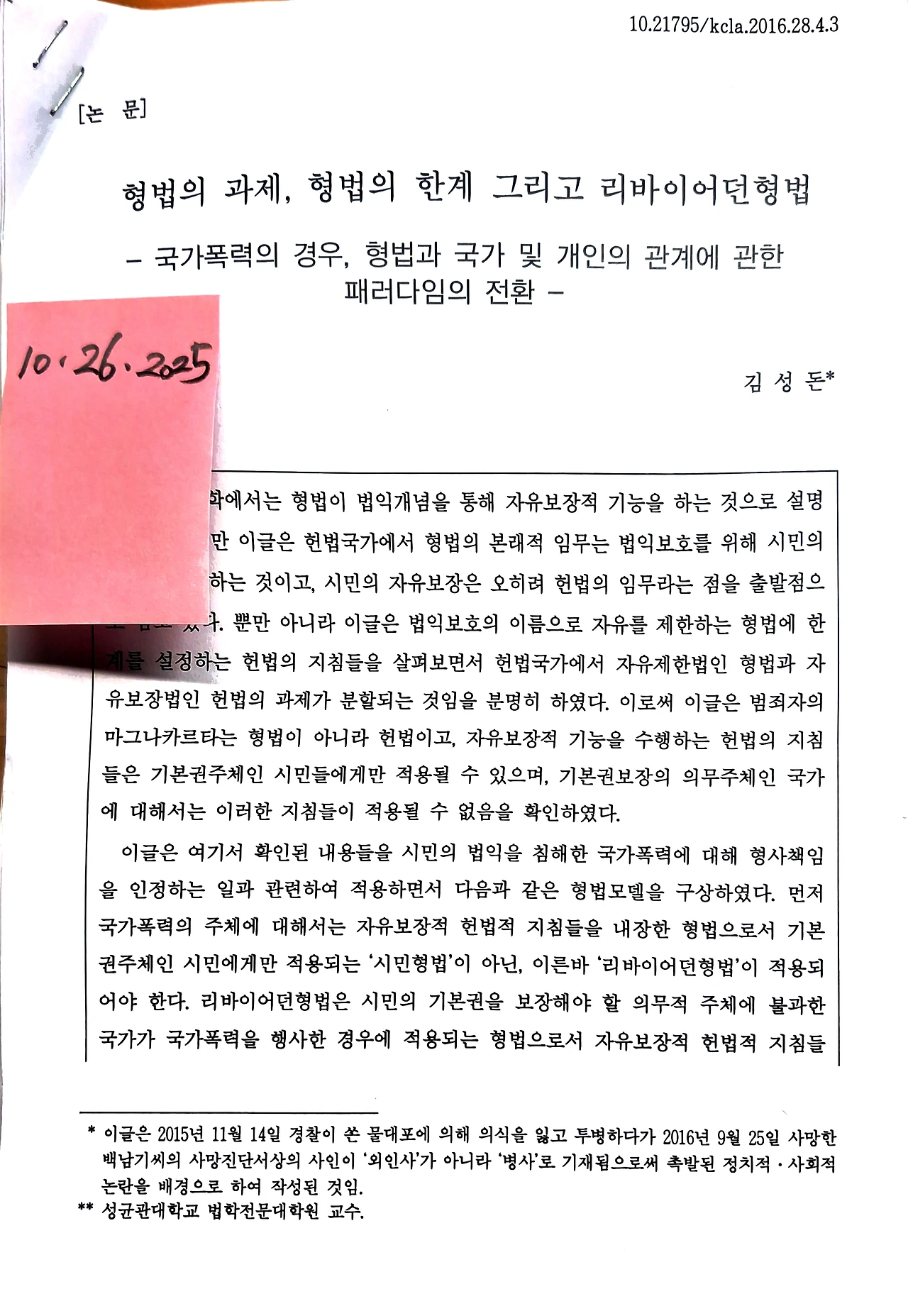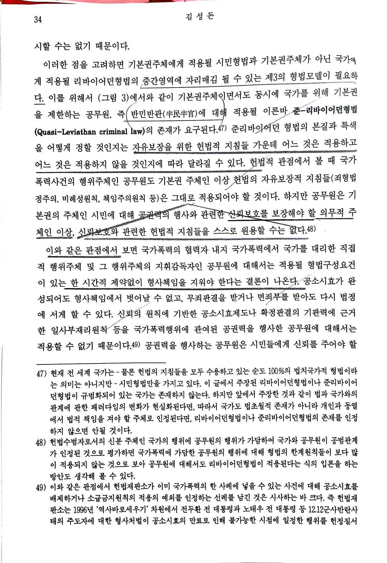 김성돈, 《형법의 과제, 형법의 한계 그리고 리바이어던형법- 국가폭력의 경우, 형법과 국가 및 개인의 관계에 관한 패러다임의 전환》, 한국형사법학회, 『형사법연구』제28권 제4호, 2016.12., 3-42면