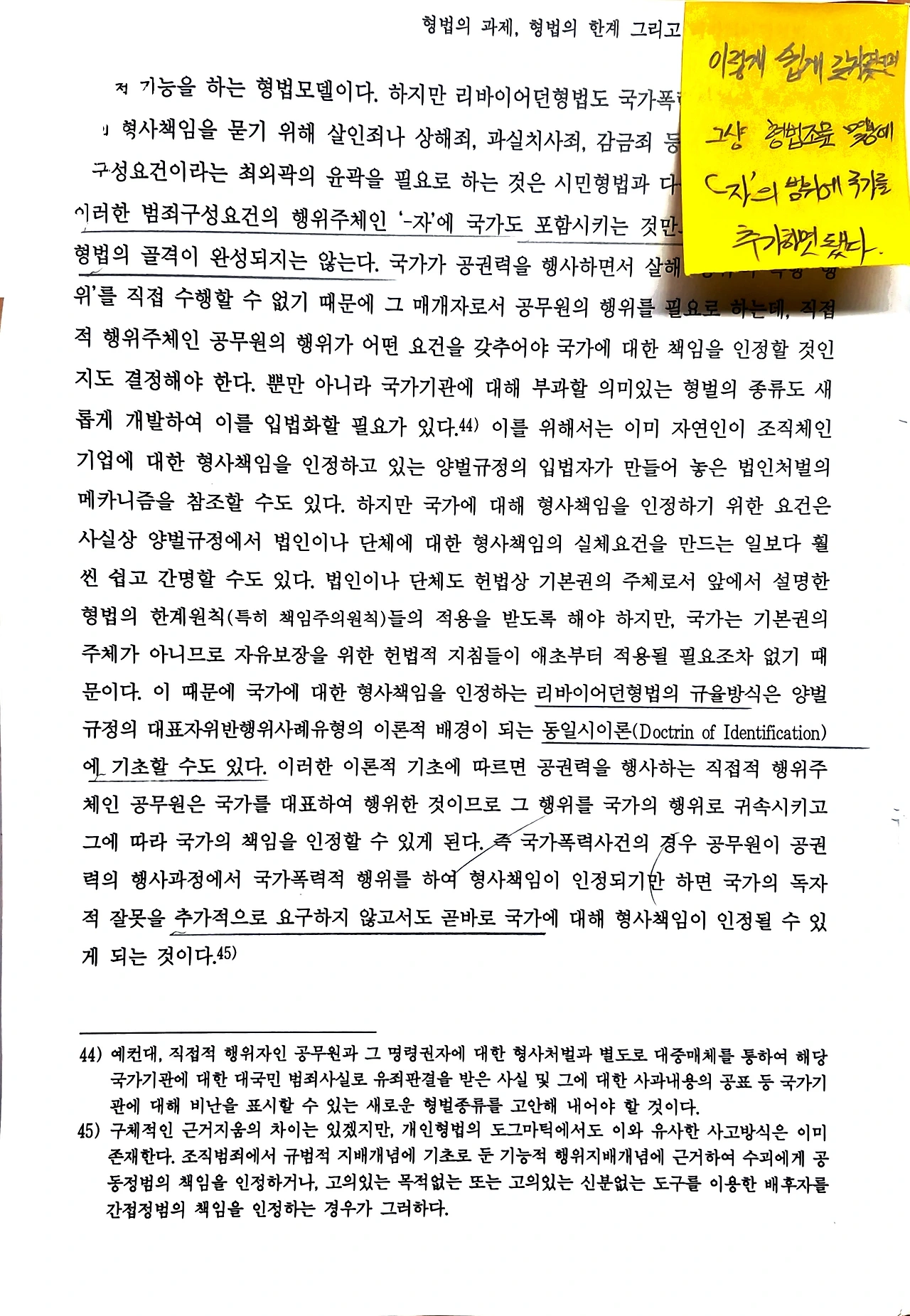전통적인 형법이론은 '방법론적 개인주의' 에 기초하여 모든 법적 책임을 '자연인'으로서 개인에게 환원시키려 한다. 이 관점에서 '국가폭력'은 '불법을 행한 공무원 개인'의 책임일 뿐, '국가'라는 조직체의 책임은 아니다. 그러나 대상논문은 이 입장이 조직이나 단체가 개인 구성원들의 행위 총합을 넘어서 갖는 '독자적 다이내믹' 을 설명하지 못하는 '존재론적 환원주의' 에 불과하다고 일축한다.
