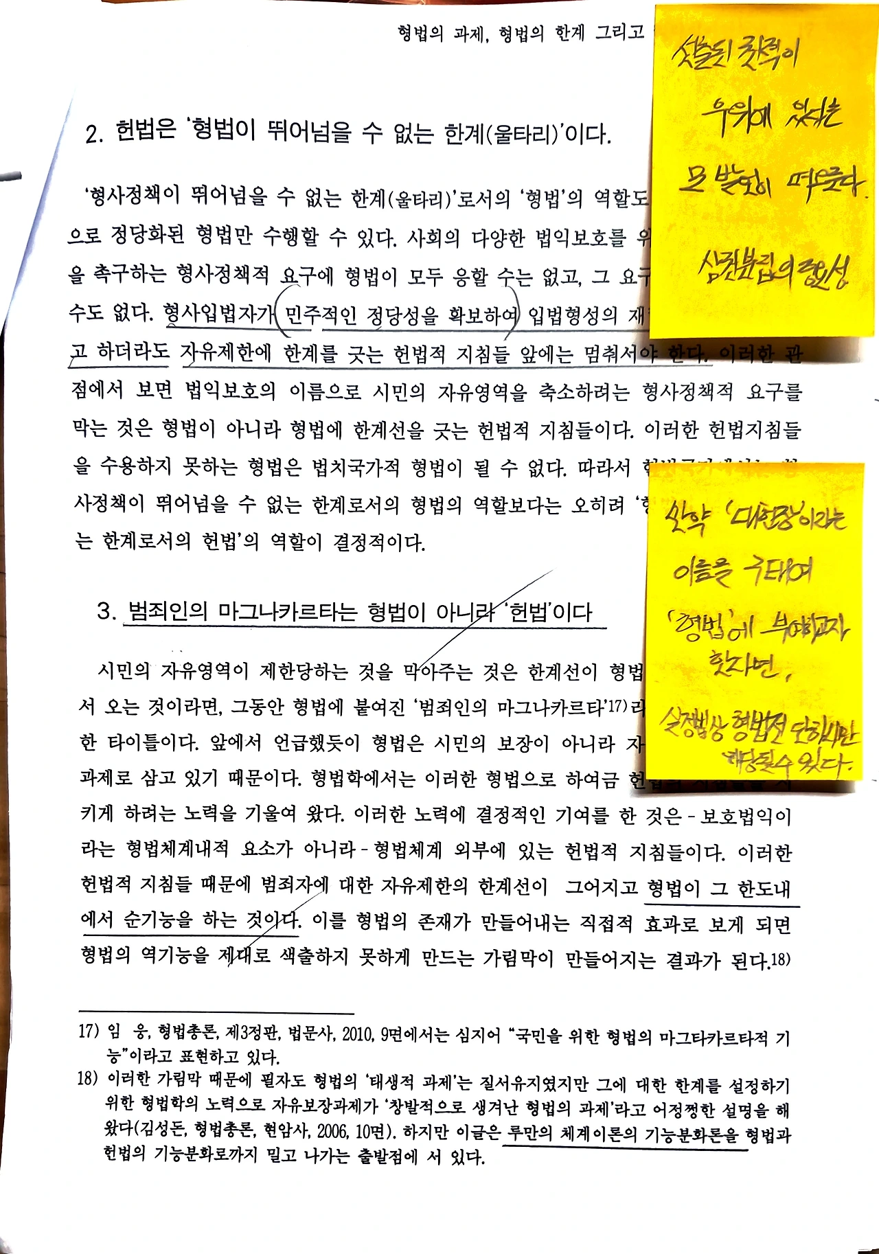 첫째, 대상논문의 방법론적 기초가 되는 '헌법과 형법의 과제분할'이라는 명제를 '비판적 법실증주의'의 관점에서 재조명하여 그 법철학적 위치를 확정한다.