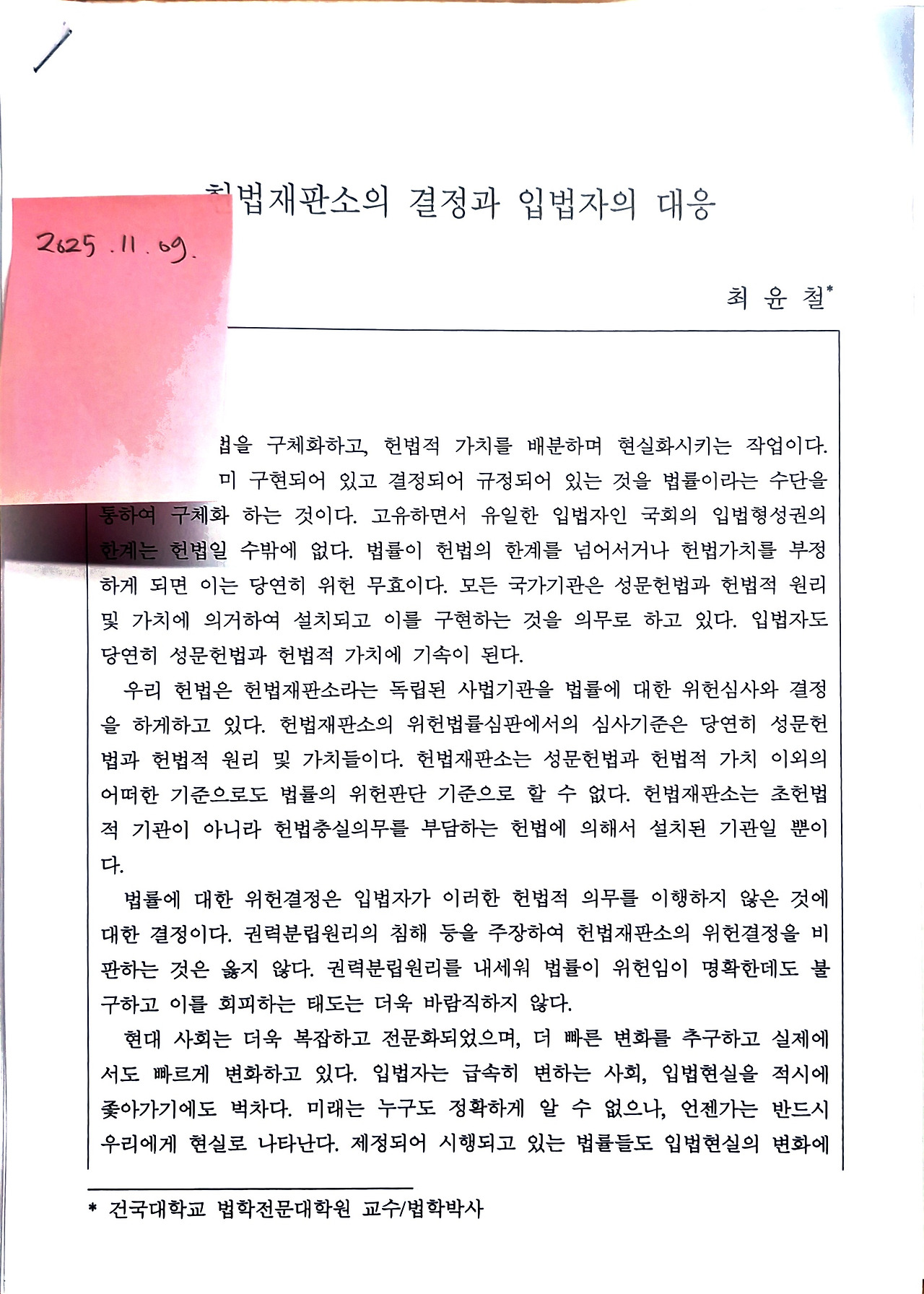 최윤철, 《헌법재판소의 결정과 입법자의 대응》, 한국헌법학회, 『헌법학연구』제18권 제3호, 2012. 6., 205-247면