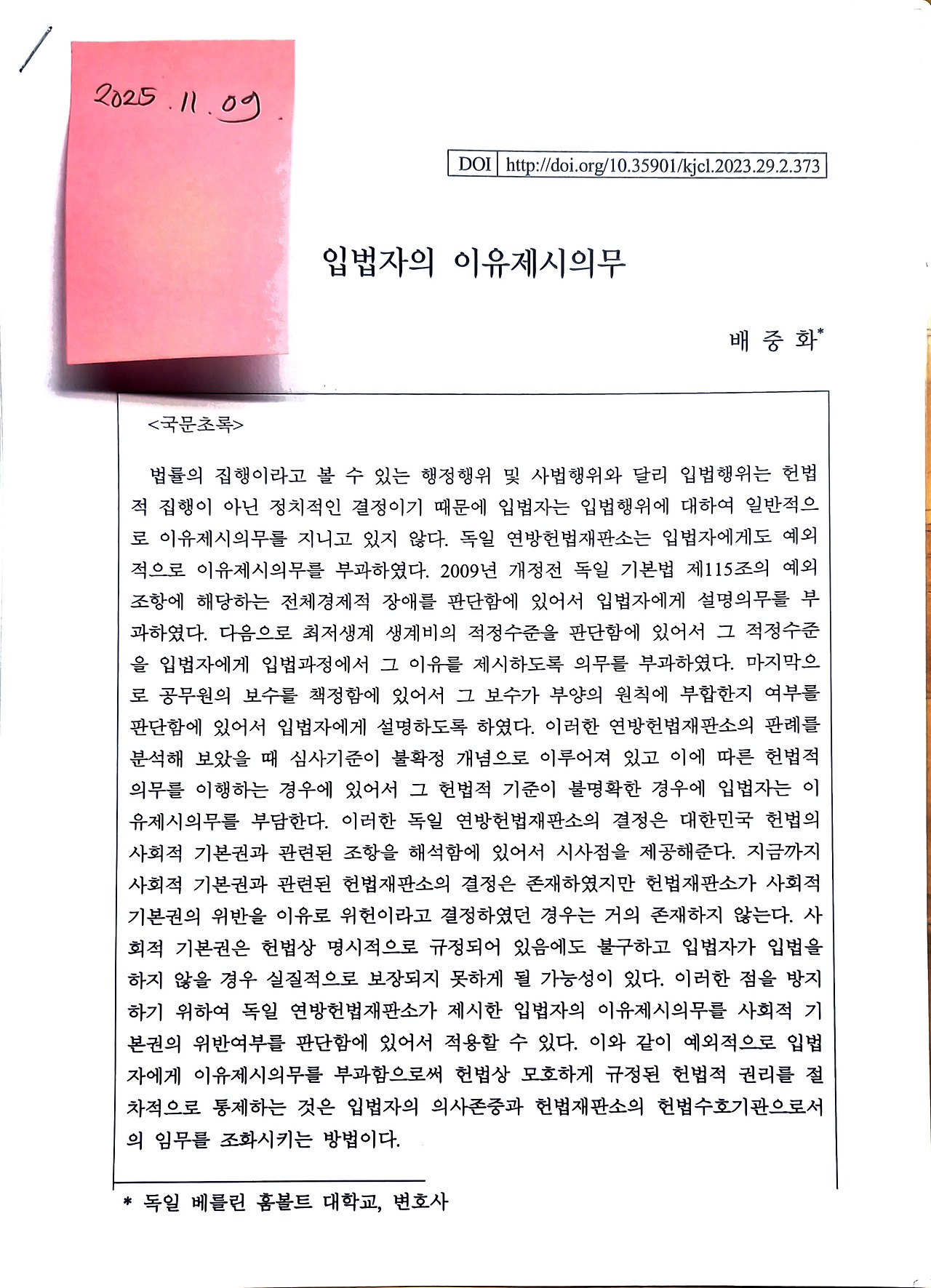 배중화, 《입법자의 이유제시의무》, 한국헌법학회, 『헌법학연구』제29권 제2호, 2023. 6., 373-396면