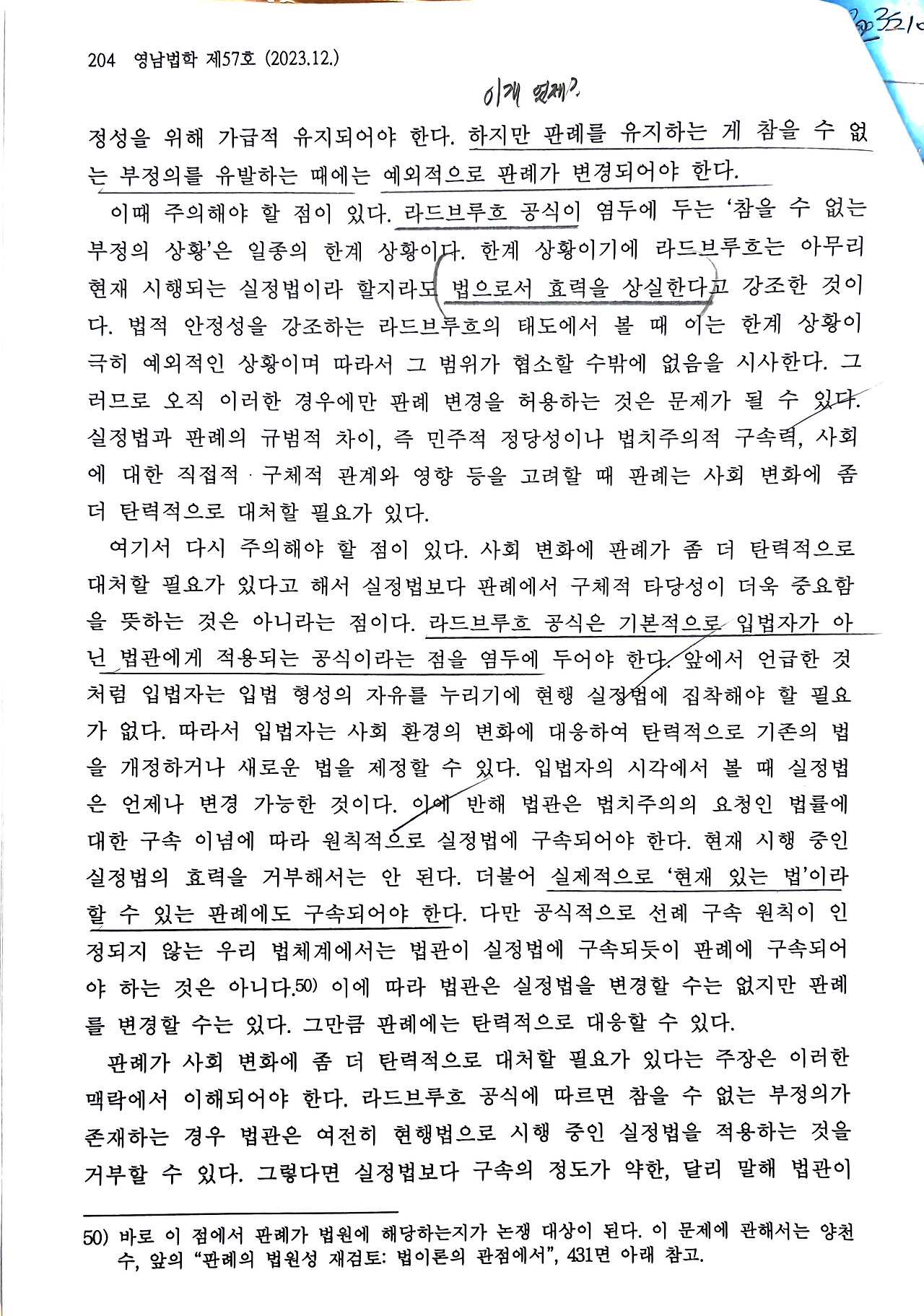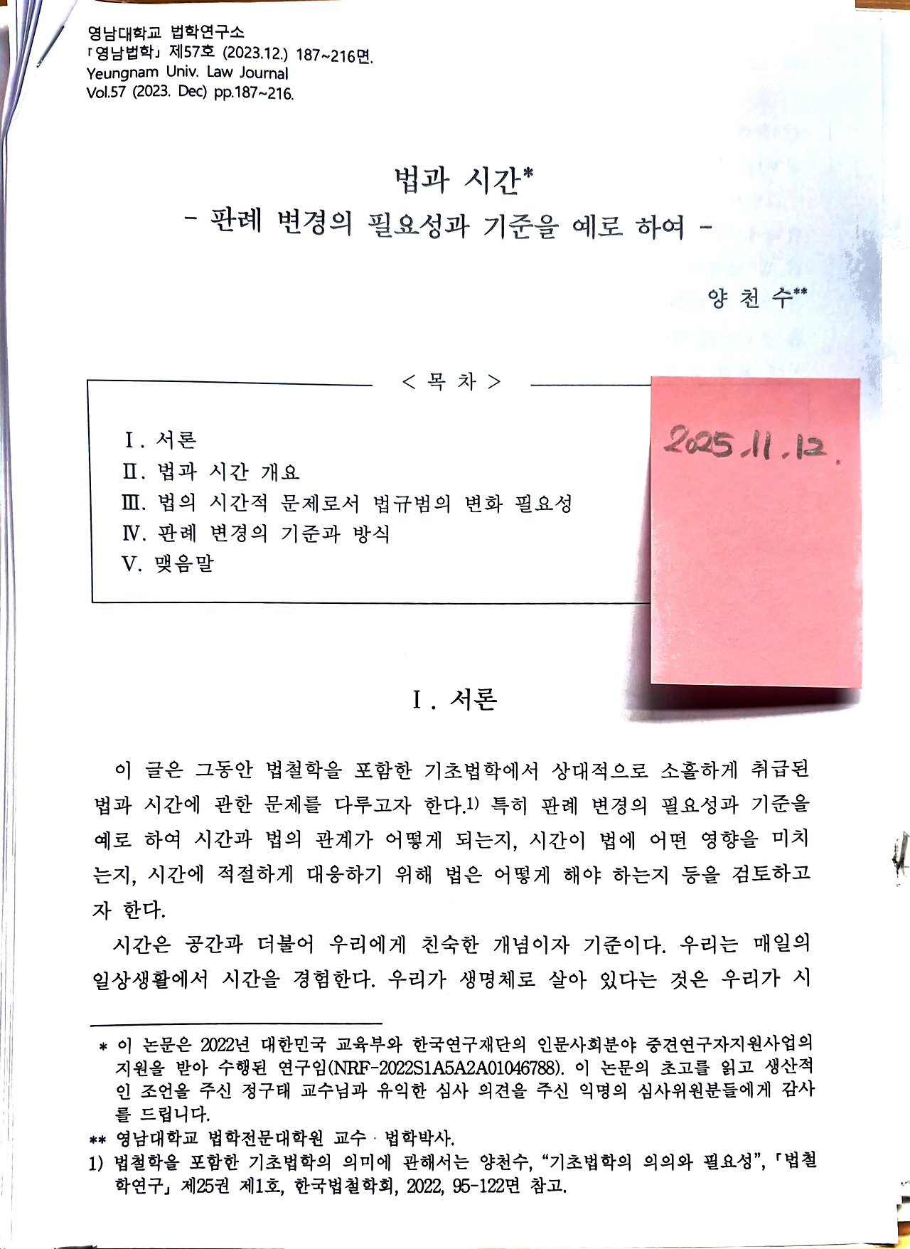 양천수, 《법과 시간-판례 변경의 필요성과 기준을 예로 하여》, 영남대학교 법학연구소, 『영남법학』제57호, 2023. 12., 187-216면