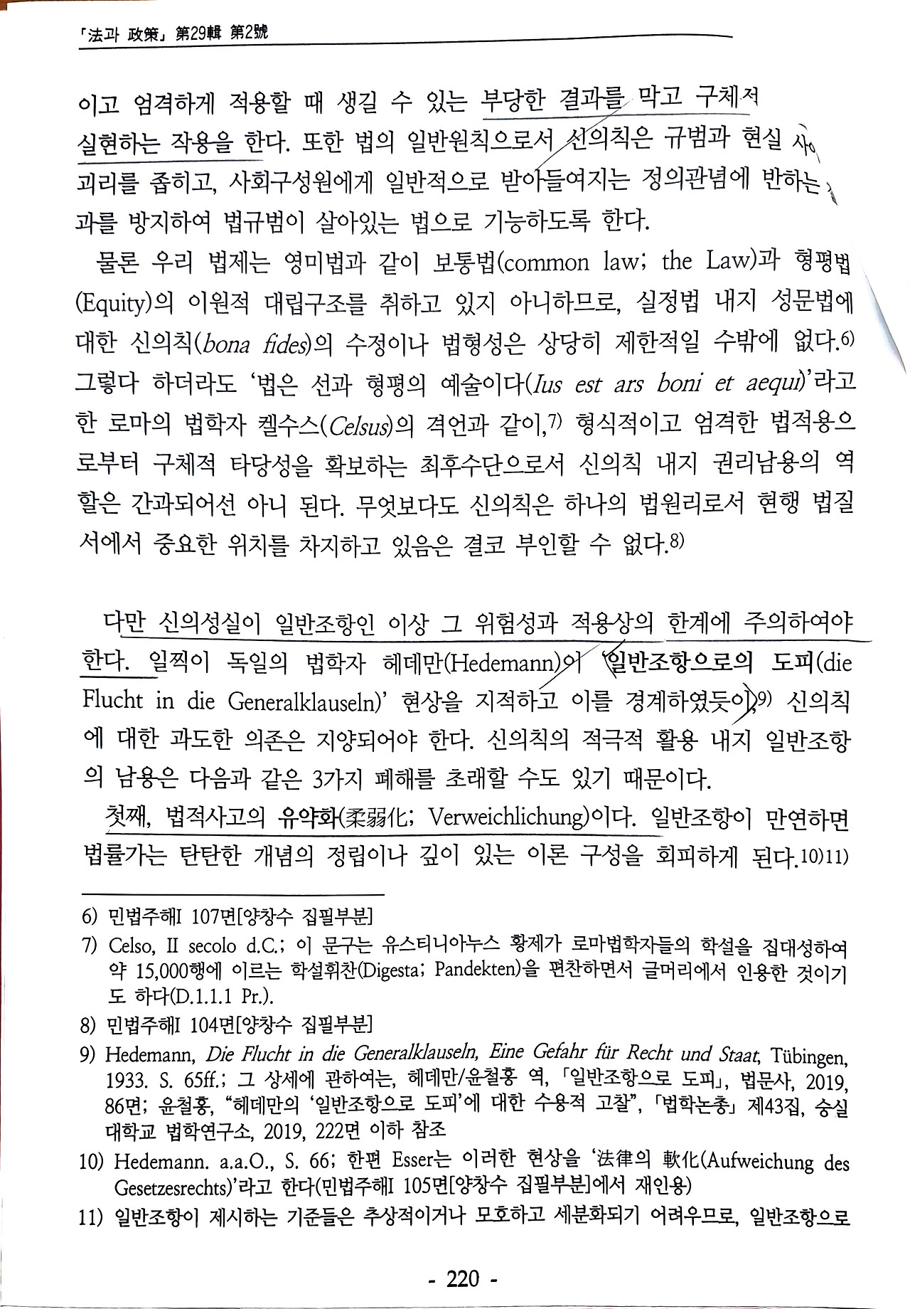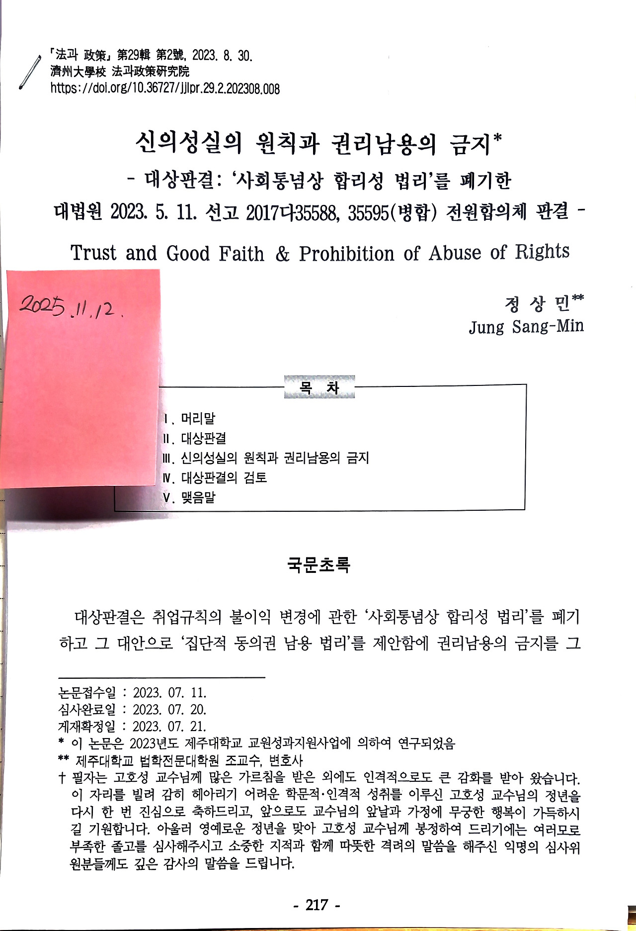 정상민, 《신의성실의 원칙과 권리남용의 금지- 대상판결 '사회통념상 합리성 법리'를 폐기한 2023. 5. 11. 선고 대법원 2017다35588, 35595(병합) 전원합의체 판결》, 제주대학교 법과정책연구원, 『법과 정책』제29집 제2호, 2023. 8., 217-267면