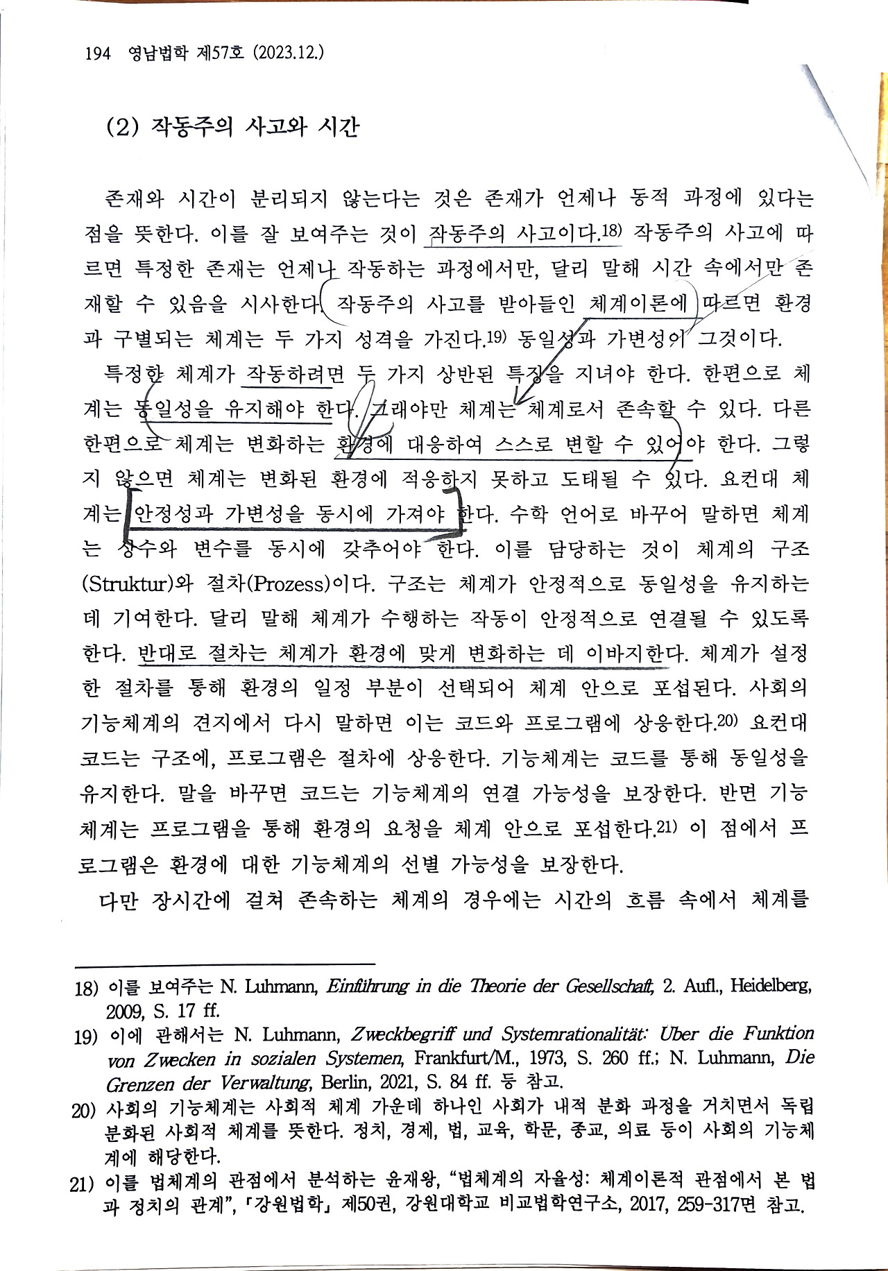 즉, 체계는 안정적인 '구조(Struktur)'를 통해 자신의 동일성을 유지함으로써 안정적으로 작동해야 하지만(안정성), 동시에 변화하는 환경에 적응하여 스스로 변하지(가변성)않으면 도태될 수밖에 없다. 법체계는 '구조'를 통해 안정성을 확보하는 동시에, '절차(Prozess)'를 통해 환경의 변화를 체계 안으로 포섭하며 스스로를 변화시킨다.