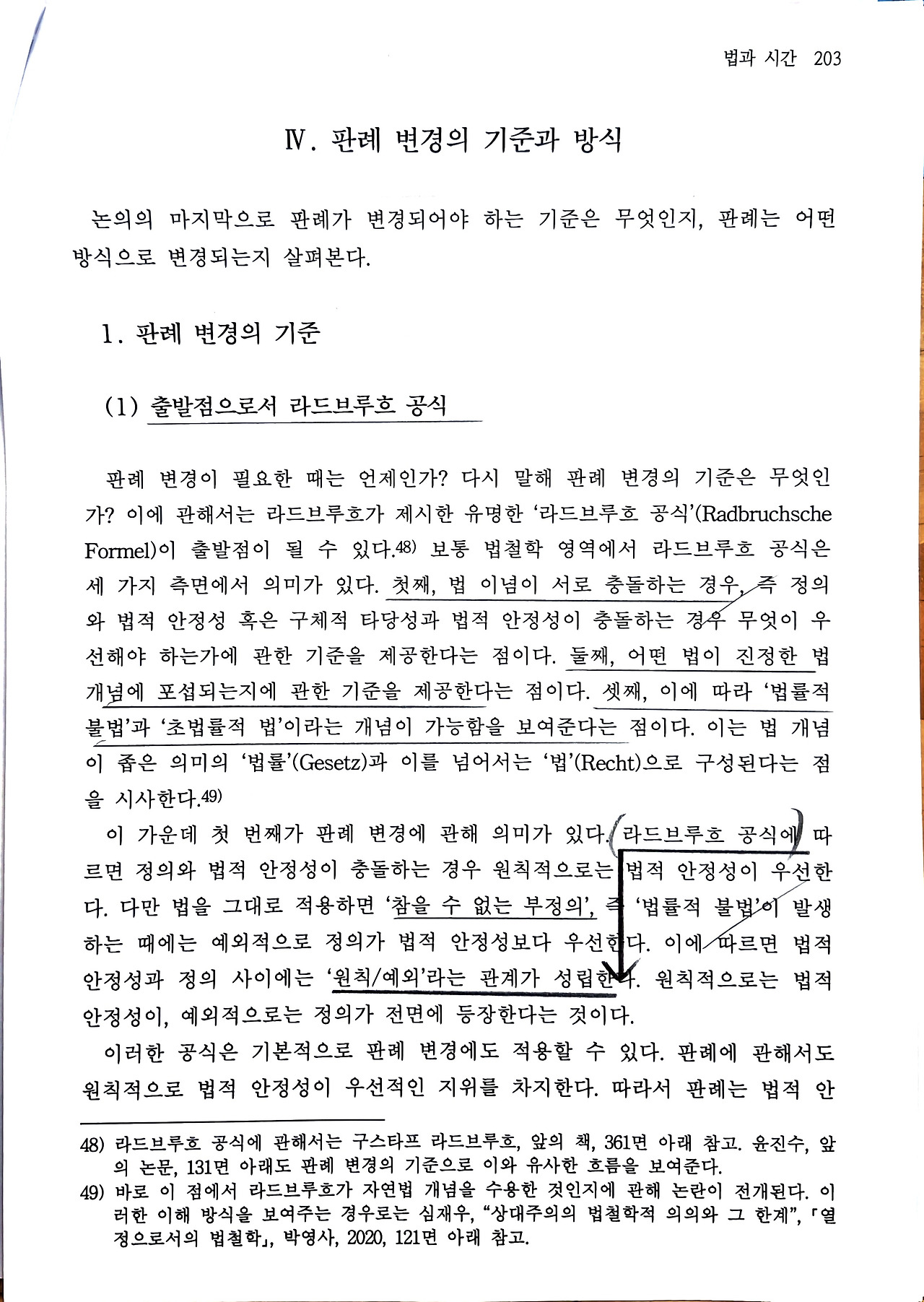 제 III장에서 확인한 '법적 안정성'의 강력한 옹호론과 제 II장에서 도출된 '변경의 필연성'이라는 두 가치가 정면으로 충돌할 때, 법학방법론은 이 긴장을 해결할 기준을 제시해야 한다. 양천수(2023)는 그 제1의 법철학적 기준으로 라드브루흐 공식을 제시한다.