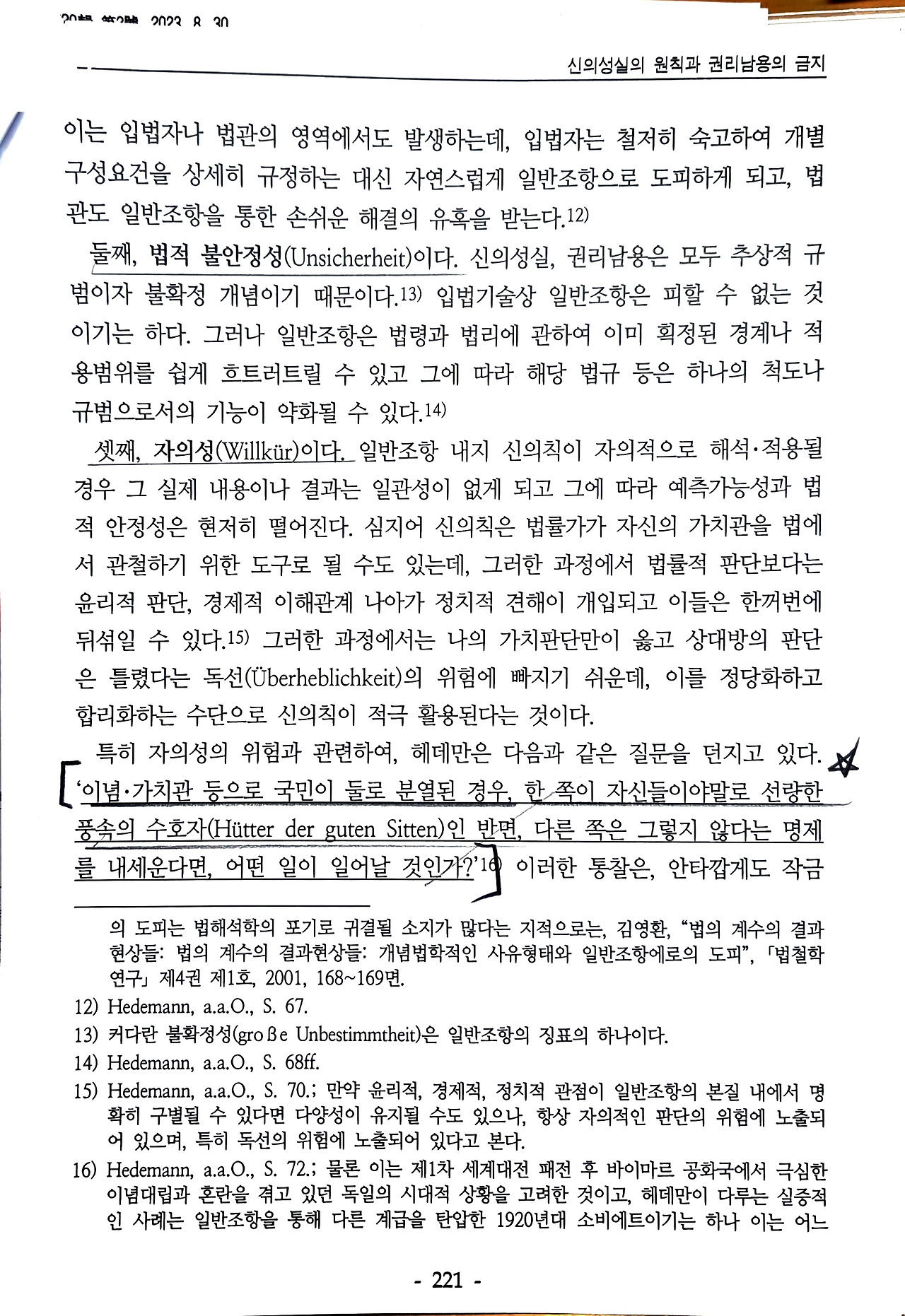 우선, 유스투스 빌헬름 헤데만(Justus Wilhelm Hedemann)은 1933년 그의 저서 《일반조항으로의 도피》에서 법학방법론의 위험성을 경고했다.