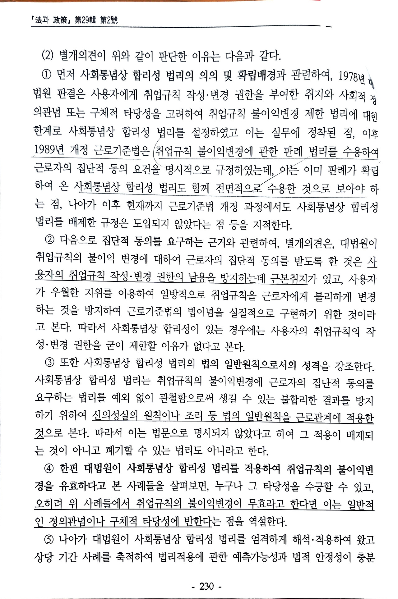 별개의견(6인)은 제 III장에서 논한 '법적 안정성 옹호론'의 입장을 대변한다. 45년간 유지되어 온 '사회통념상 합리성 법리'는 타당하며, 폐기되어서는 안 된다는 것이다. 여기서 인용하는 기존 판례 법리는 '신의성실의 원칙'이나 '조리(條理)'와 같은 '법의 일반원칙(allgemeine Rechtsgrundsätze)'을 근로관계라는 구체적 영역에 적용한 것이다. 이는 법문에 명시되지 않아도 당연히 인정되는 법원(法源)이라는 것이다. 별개의견에 따르면, 이 법리는 경직된 강행법규(근로기준법상 집단적 동의)를 예외 없이 관철할 경우 발생할 수 있는 '불합리한 결과'와 '구체적 타당성'의 심각한 결여를 방지하는 기제였다. 즉, '신의칙'이라는 유연한 정의의 원칙을 통해 '법적 안정성'(판례의 예측가능성)과 '구체적 정의'를 '조화'시키는 역할을 수행해왔다.