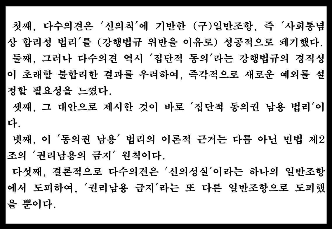 이는 다수의견이 새로 제시한 '동의권 남용' 법리가 사실상 적용되기 불가능한, 사문화될 가능성이 높은 기준임을 암시할 수 있는데, 결국 '시간의 흐름'에 따른 법의 유연한 적응이라는 제 II장의 법철학적 과제는 해결되지 못했다. 다수의견은 '사회통념상 합리성'이라는 유연했던(그러나 상위법에 위반되었던) 기준을 폐기하고, '권리남용'이라는 (사실상) 극도로 경직된 기준으로 대체함으로써, 법적 안정성을 새로운 불확정성 속으로 빠뜨리고 말았다.