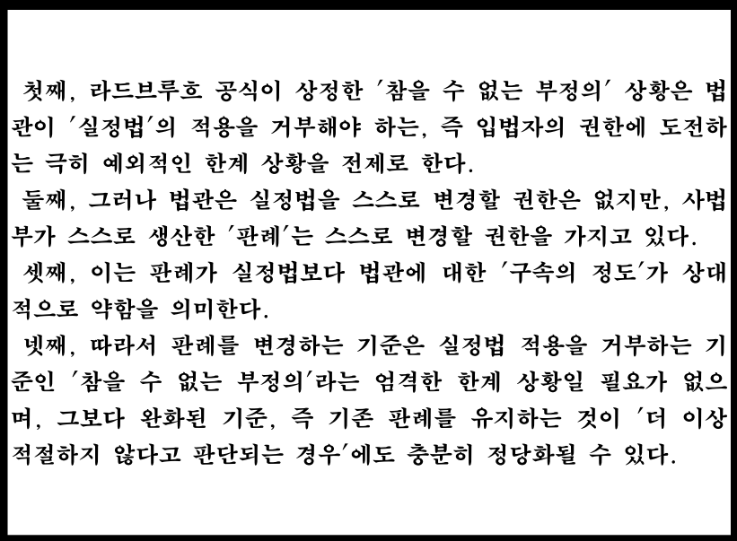 양천수는 이 라드브루흐 공식을 '판례 변경'의 기준에 적용하면서, 매우 중요한 방법론적 변용(Modifikation)을 시도한다. 이는 판례 변경의 문턱을 낮추는 핵심적인 논증이다.