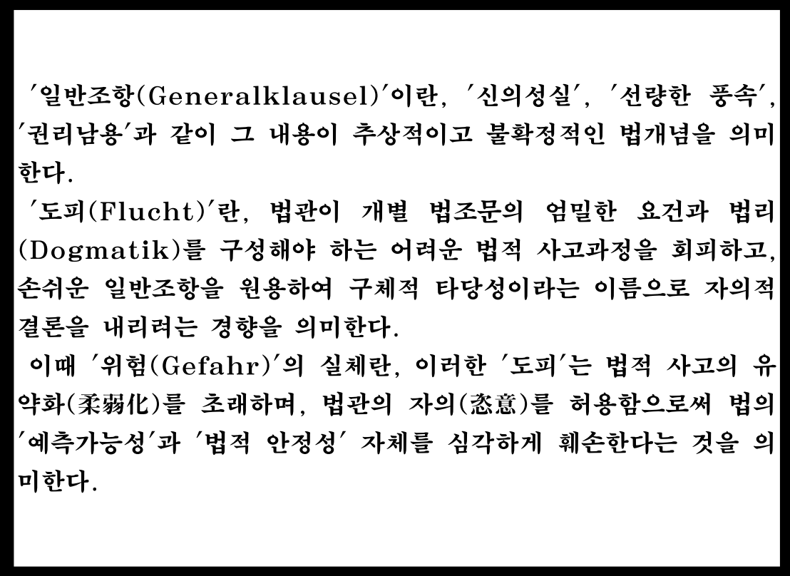 이 복잡한 긴장 관계를 해명하기 위해, 양천수가 제시한 구스타프 라드브루흐(Gustav Radbruch)의 공식과 '참을 수 없는 부정의(unerträgliches Unrecht)'라는 한계 기준 , 그리고 정상민이 지적한 유스투스 빌헬름 헤데만(Justus Wilhelm Hedemann)의 '일반조항으로의 도피(die Flucht in die Generalklauseln)'라는 방법론적 비판 을 핵심적인 분석 도구로 원용(援用)할 것이다.