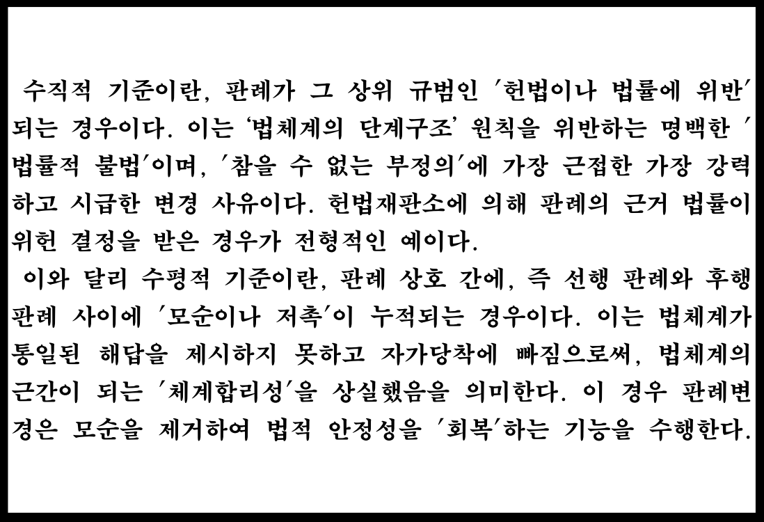 요컨대, 다수의견은 기존 판례가 '내부적-수직적 기준')을 명백히 위반하였다고 본 것이다. 이는 법체계의 단계구조를 교란하는 '참을 수 없는' 규범적 모순(normativer Widerspruch)으로서, '시간의 흐름'에 관계없이 즉각 변경되어야 할 대상이었던 것이다.