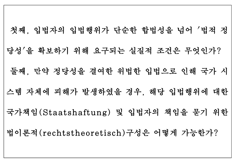 이는 입법 절차의 형식적 합법성(formelle Legalität)은 충족하였을지 모르나, 그 내용과 목적에 있어 실질적 정당성(materielle Legitimität)을 결여했을 수 있다는 심각한 의문을 제기한다.