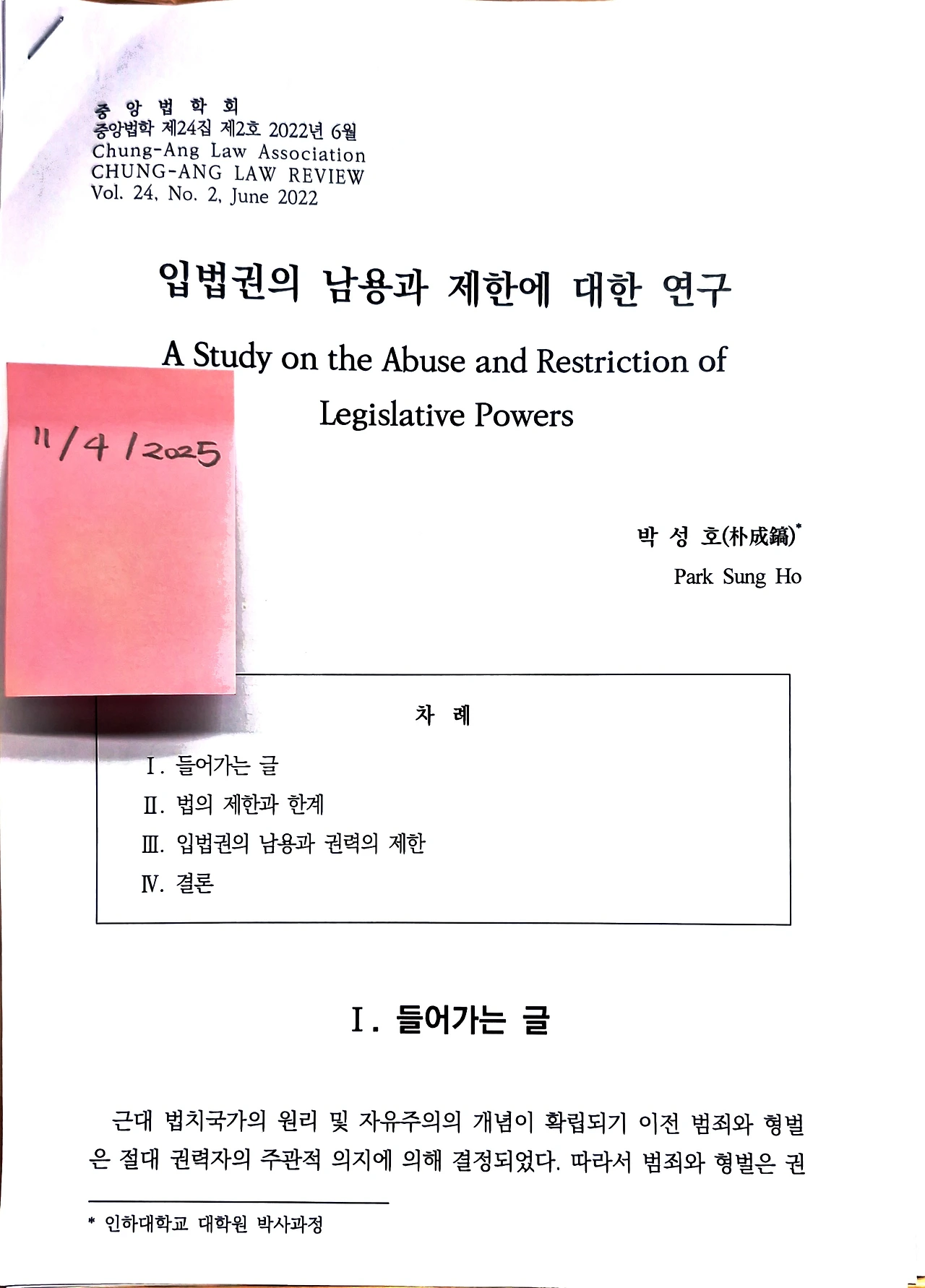 박성호, 《입법권의 남용과 제한에 대한 연구》, 중앙법학회, 『중앙법학』제24집 제2호, 2022. 6. , 133-161면