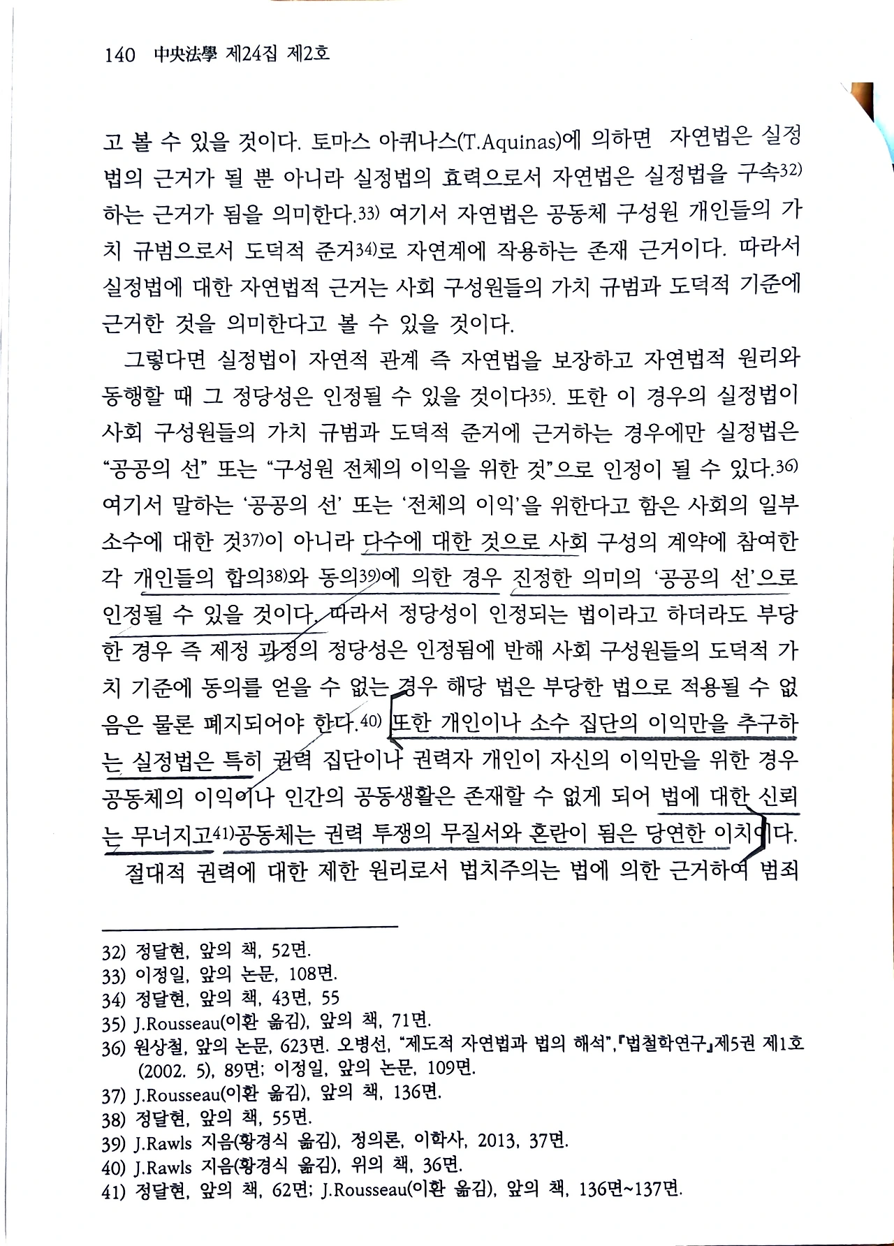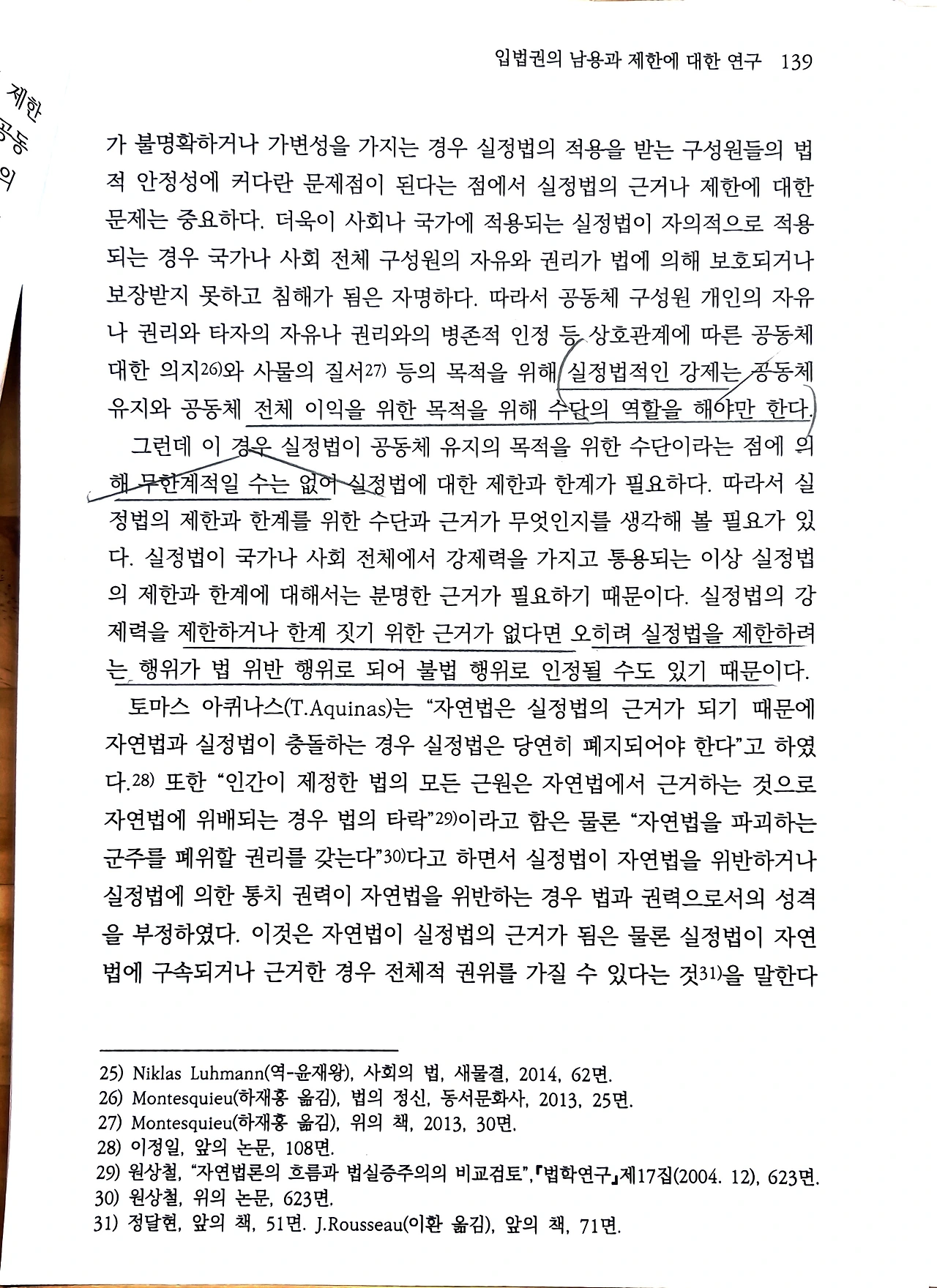 입법의 정당성 근거와 관련하여, 박성호는 토마스 아퀴나스(T. Aquinas)를 원용하며 법이 "공공의 선" 을 지향하고 "자연법" 에 근거해야 함을 역설한다. 그에 따르면 법은 "공동체 전체 이익을 위한 목적 범위에서 필요 최소한"에 그쳐야 하며, 무엇보다 "국가 권력의 자기 구속 원리" 에 따라야 한다.