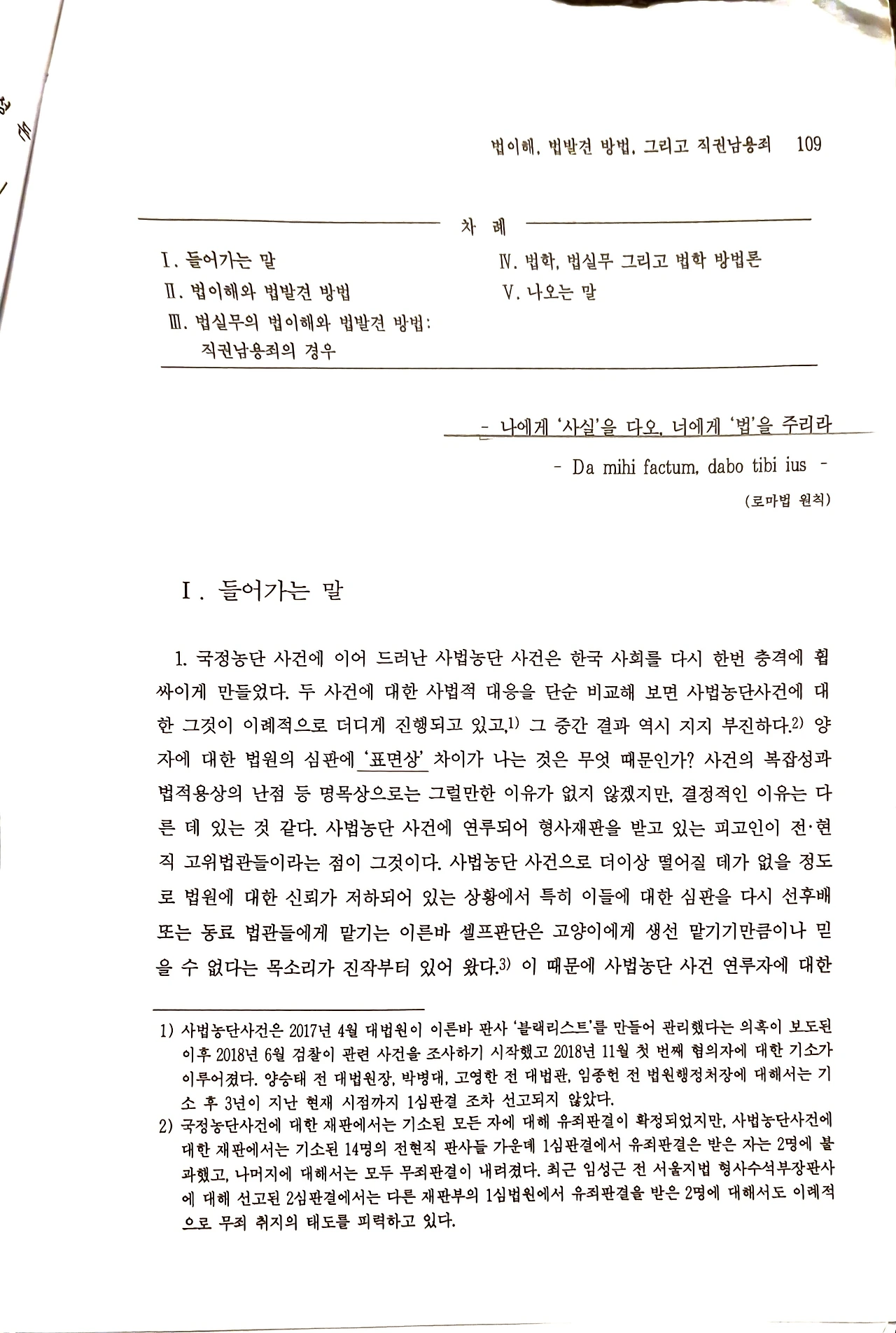 둘째, 이른바 '사법농단' 사건에 연루된 법관의 직권남용 혐의에 대해 무죄를 선고한 하급심 판결을 분석한다. 이 판결은 "'권한 없으면 남용 없다'"는 지극히 형식논리적인 태도, 즉 19세기 "개념법학적 사고"에 회귀하여 기계적 삼단논법을 적용함으로써 구체적 사안의 실질을 외면했다고 비판한다.