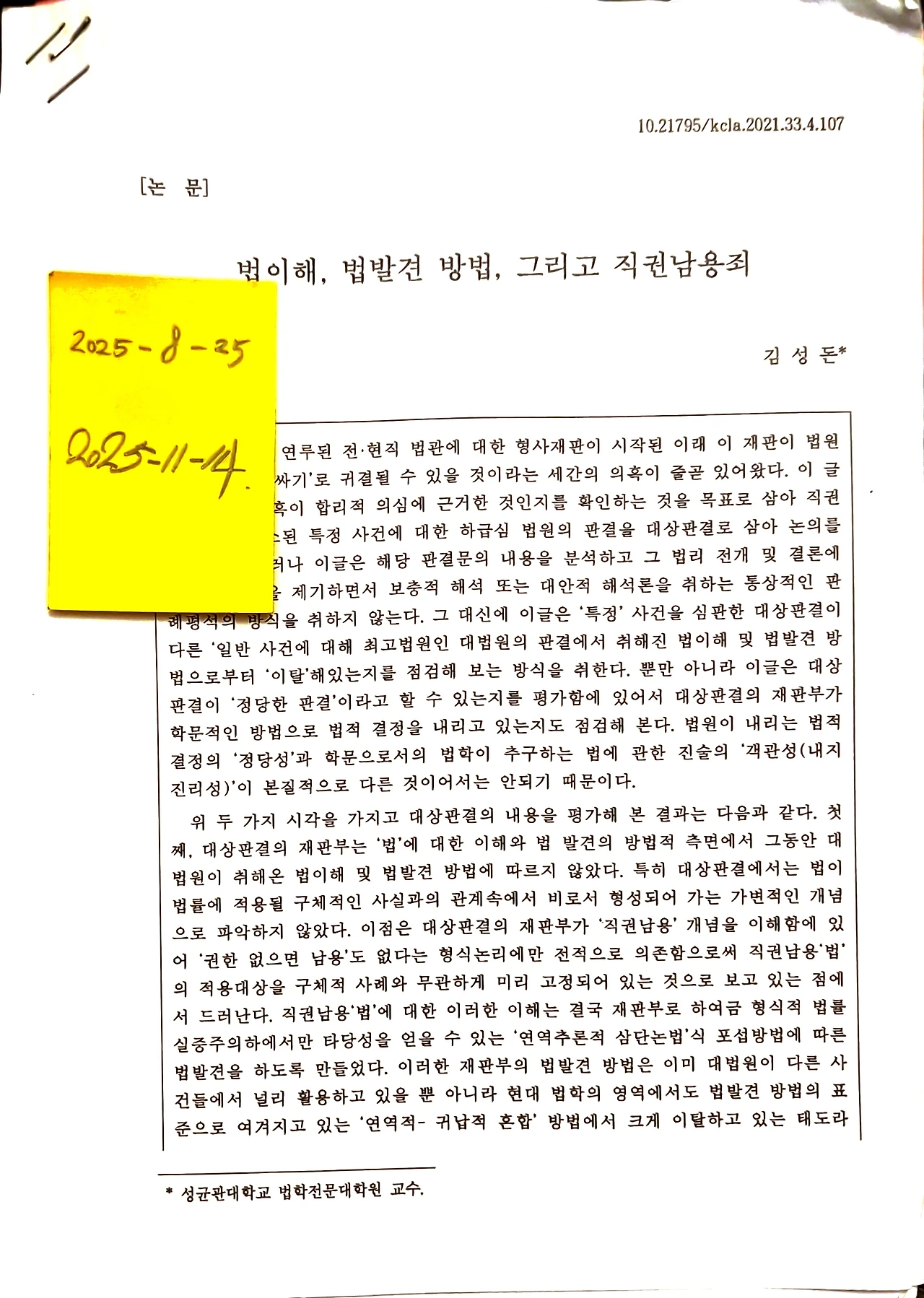 김성돈, 《법이해, 법발견방법 그리고 직권남용죄》, 한국형사법학회, 『형사법연구』 제33권 제4호, 2021., 107-171면