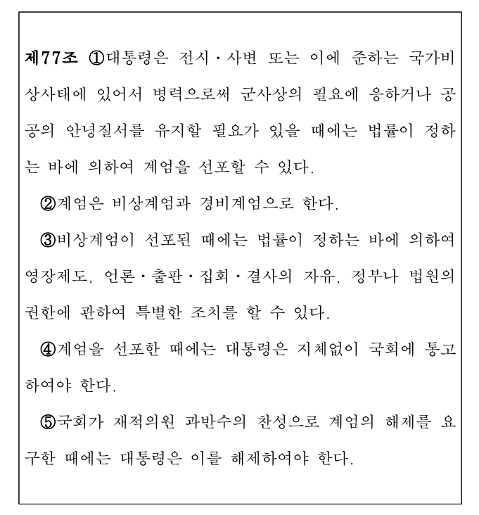 3) 대놓고 대통령의 계엄선포와 관련한, 일련의 사건을 나열하는 건 내 전문이 아니다. 내가 할 수 있는건, 조문의 내용중, 특정 키워드에 관한 '최소한의 쟁점과 의문점'을 적고, 이를 풀어쓰는 것이다. 그게 내 최선전략이었다. 그렇다. 5개 조항에 대해, 각 조항마다 중요 키워드라고 생각되는 것을 골라서, 이를 설시(說示)하면 된다. 하나씩 살펴보자. 최대한 빨리.