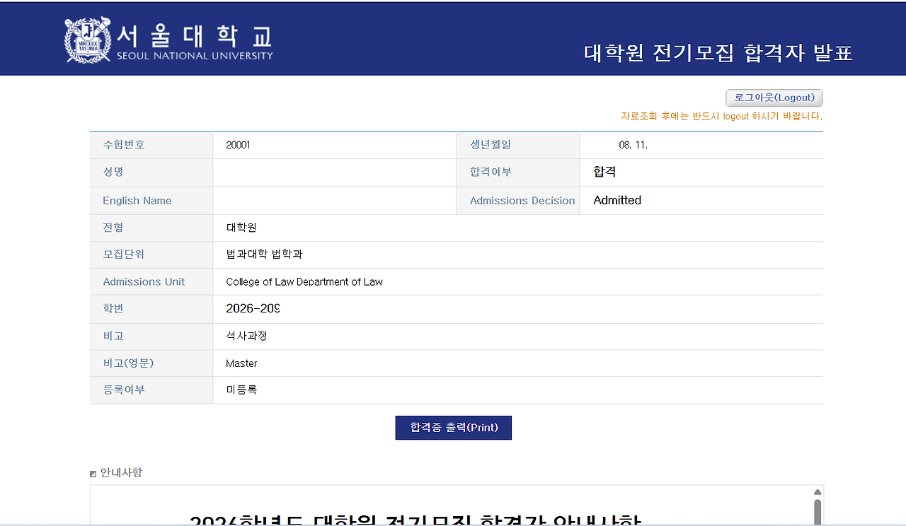 금일, 11월 20일 오후 4시에 서울대학교 일반대학원 전기모집 합격자발표가 있었고, 감사하게도 명단에 이름이 있었습니다.