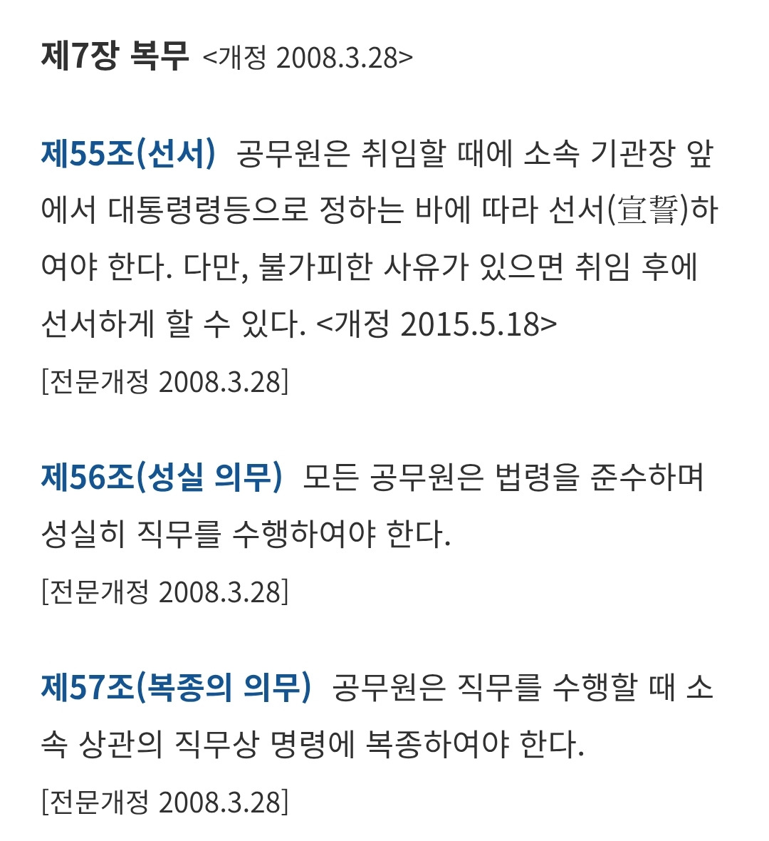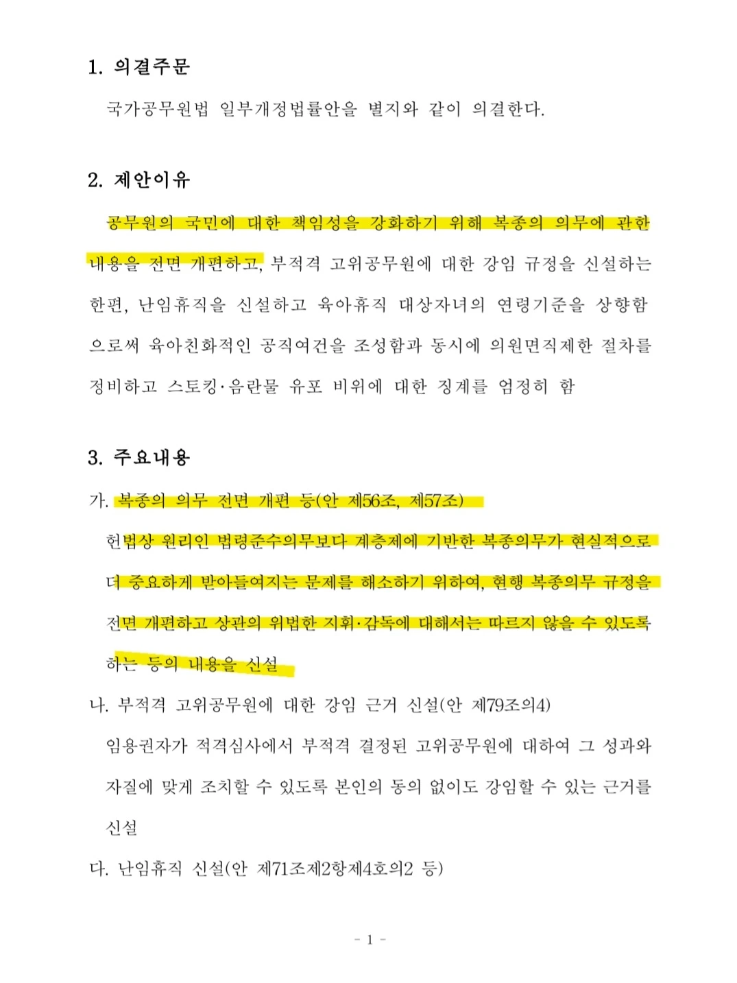 이는 인사혁신처가 최근 입법예고한 「국가공무원법」 개정안에서 확인할 수 있는바, 바로 1949년 제정 이래 76년간 유지되어 온 '복종의 의무'라는 용어를 삭제하고, 이를 '직무상 지시 준수'로 변경하며 위법한 명령에 대한 거부권을 명문화하겠다는 것이다.