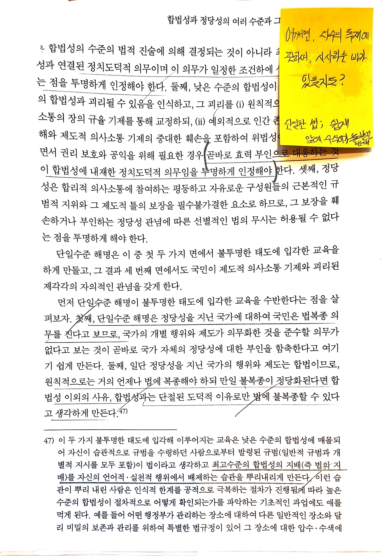 그렇다면, 법규에 적힌 '복종의무'는 기계적인 것이 아니라, 그 명령이 최고 수준의 정당성(정치도덕적 정당성)을 담보하고 있는지를 전제로 성립하는 조건부 의무임을 간접적이나마 확인할 수 있다.